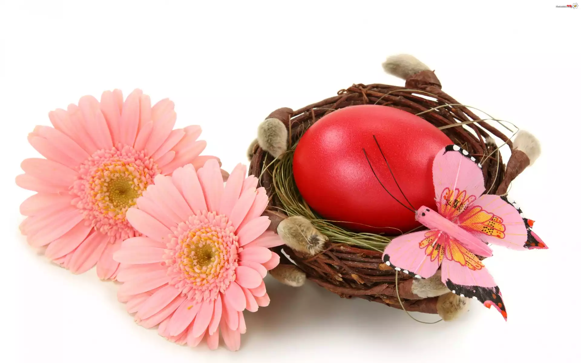 Kwiat Wielkanoc, Gniazdo, Kolorowe, Jajko, Różowe, Gerbery, Motylek