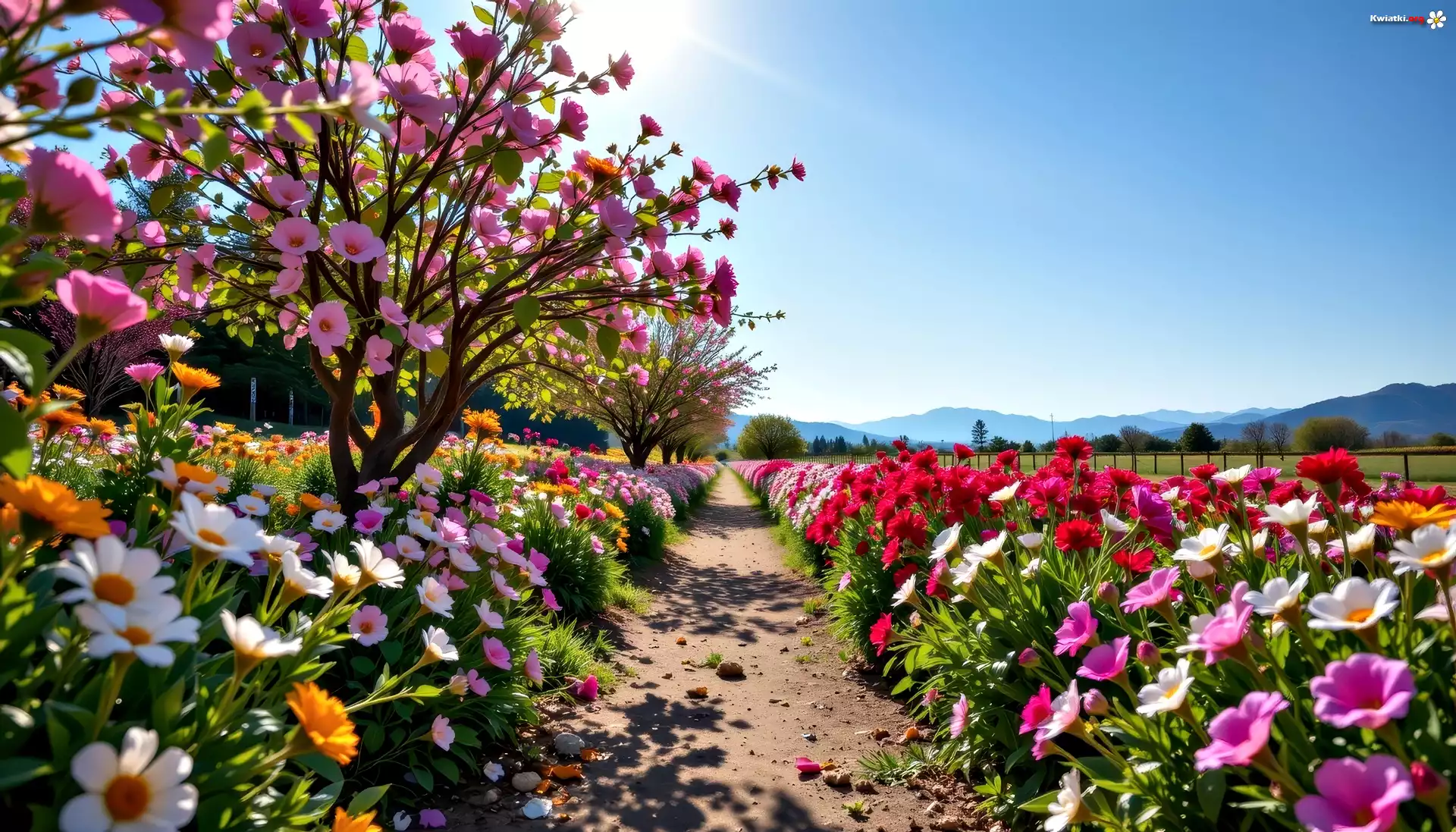 Ścieżka, Kwiaty, Drzewa, Góry, Grafika AI - Zdjęcia