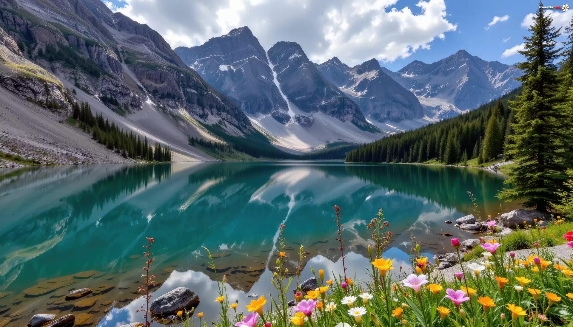Kwiaty, Jezioro, Brzeg, Góry, Lasy, Niebo, Grafika - Zdjęcia