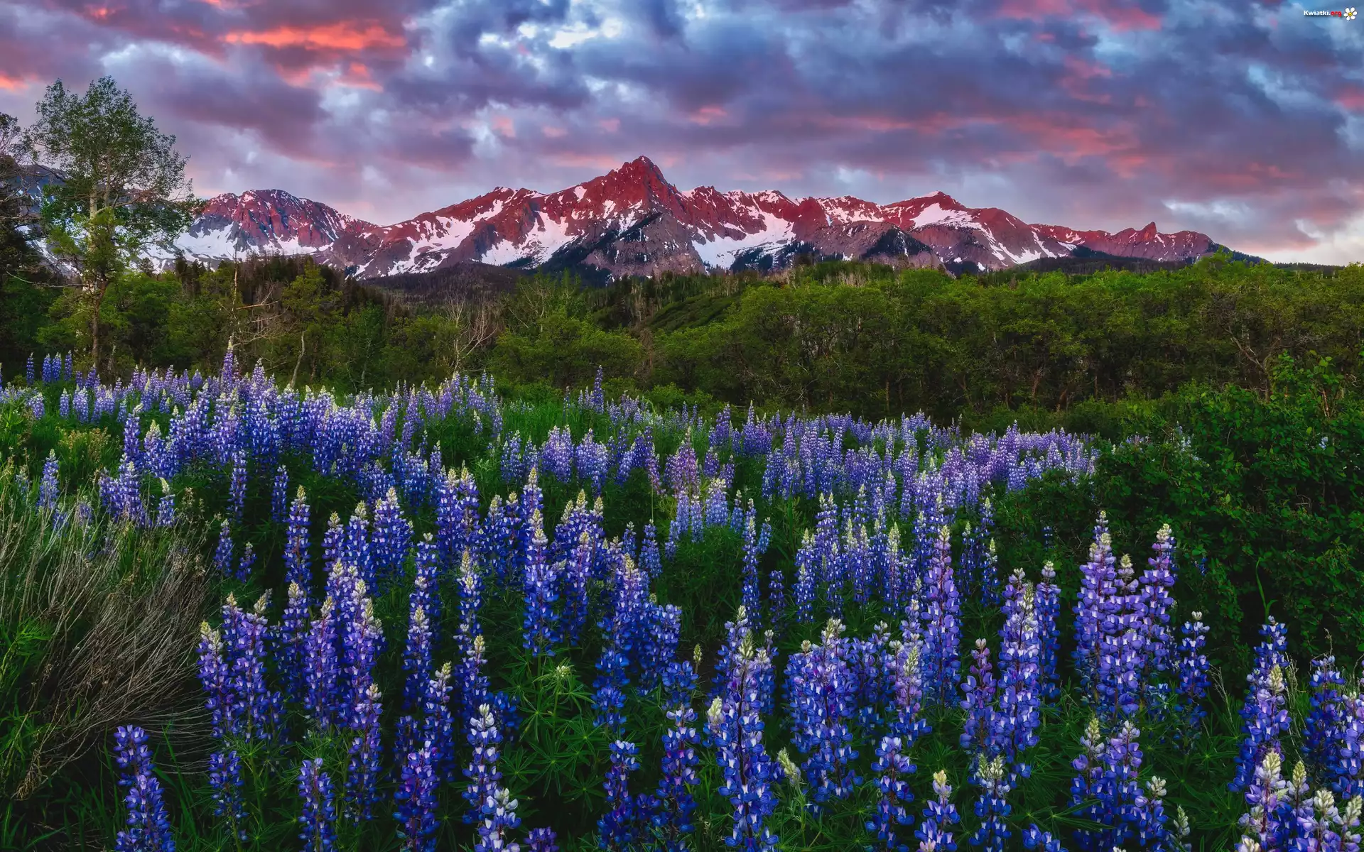 Stany Zjednoczone, Kolorado, San Juan Mountains, Mount Sneffels, Góry, Polana, Kwiaty, Łubin, Drzewa, Zieleń, Chmury, Zachód słońca - Zdjęcia |