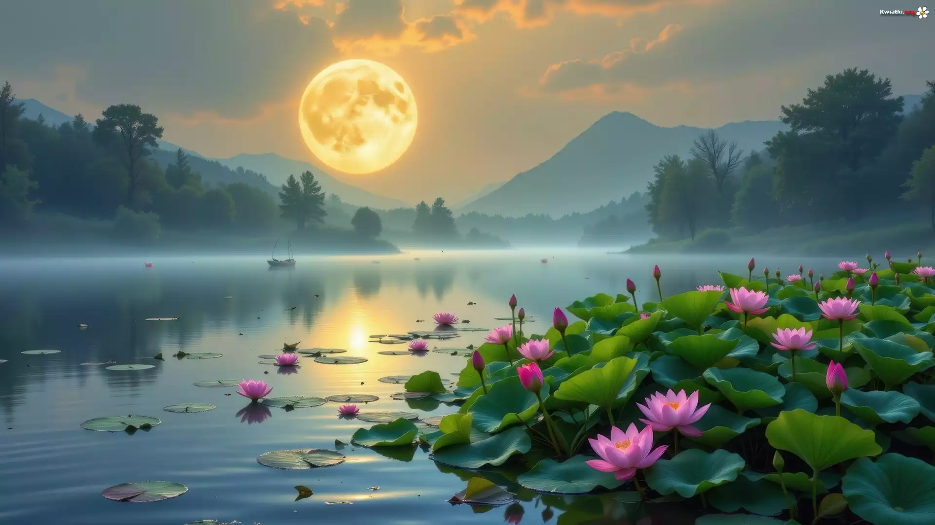Kwiat Góry, Jezioro, Mgła, Księżyc, Lilie wodne, Drzewa, Grafika AI