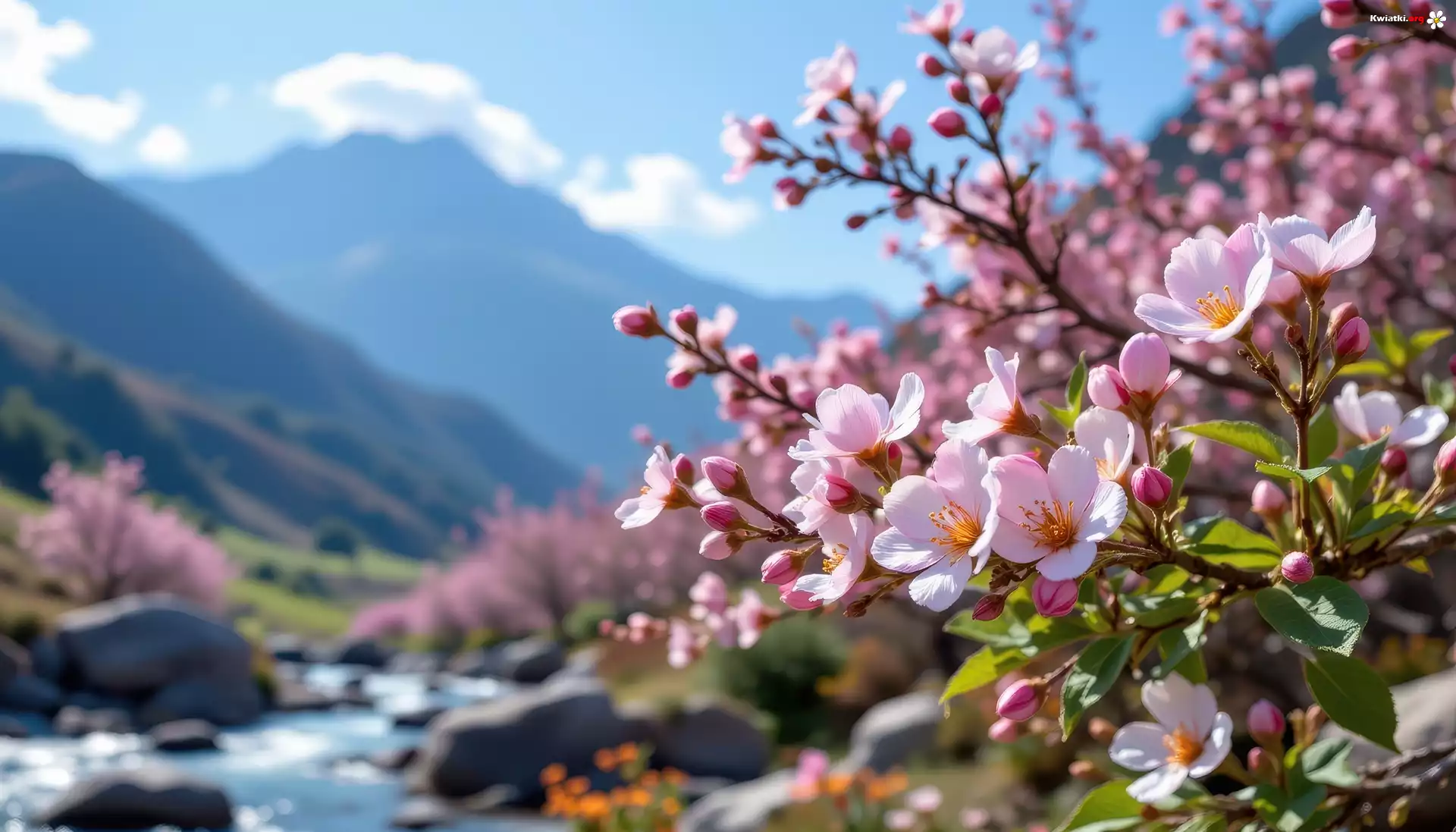 Kwiat Różowe, Kwiaty, Gałązki, Góry, Niebo, Grafika AI