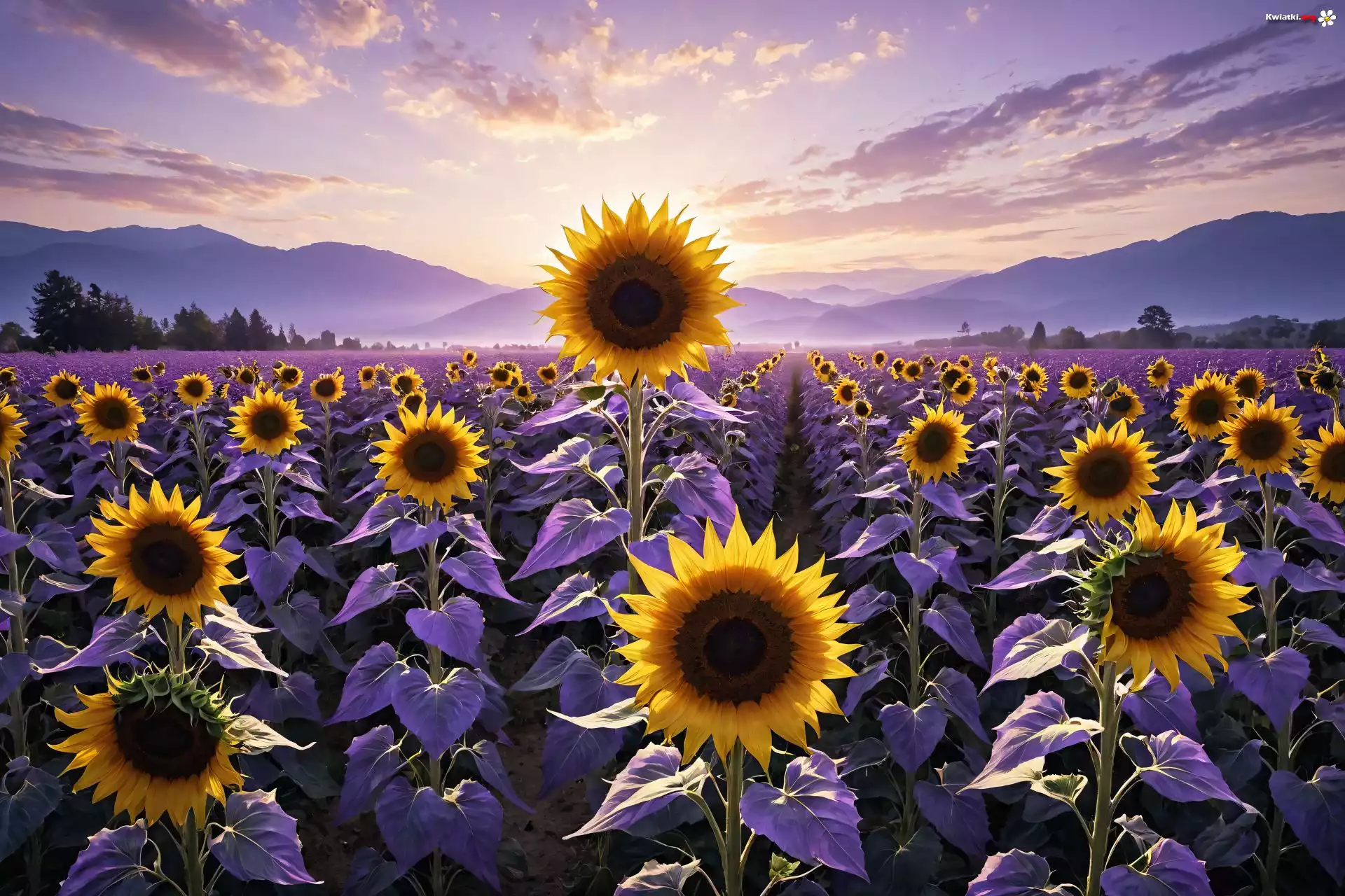 Kwiat Pole, Słoneczniki, Drzewa, Góry, Niebo, Grafika
