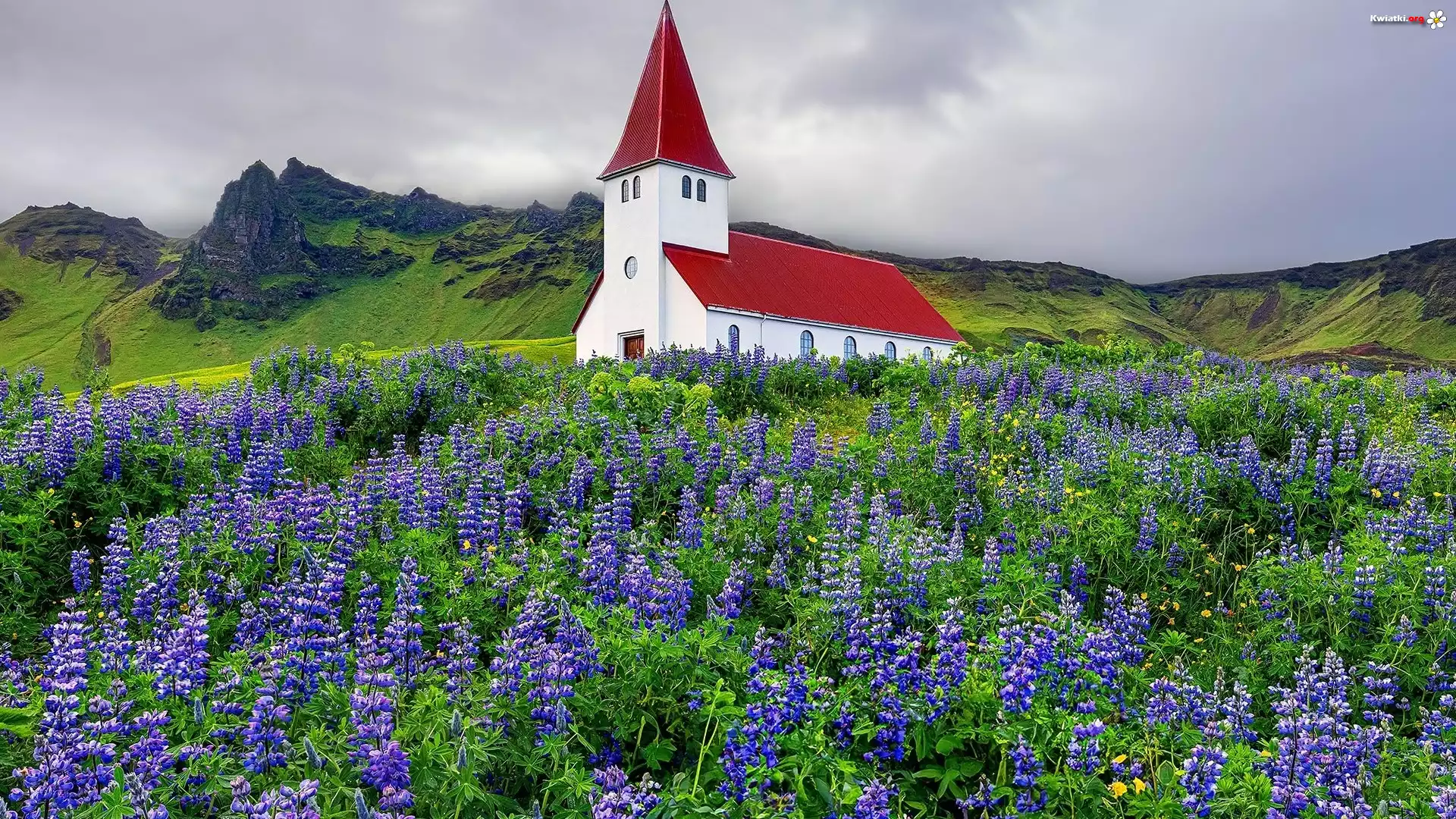 Góry, Kwiaty, Łubin, Kościół, Miejscowość Vik i Myrdal, Islandia - Zdjęcia