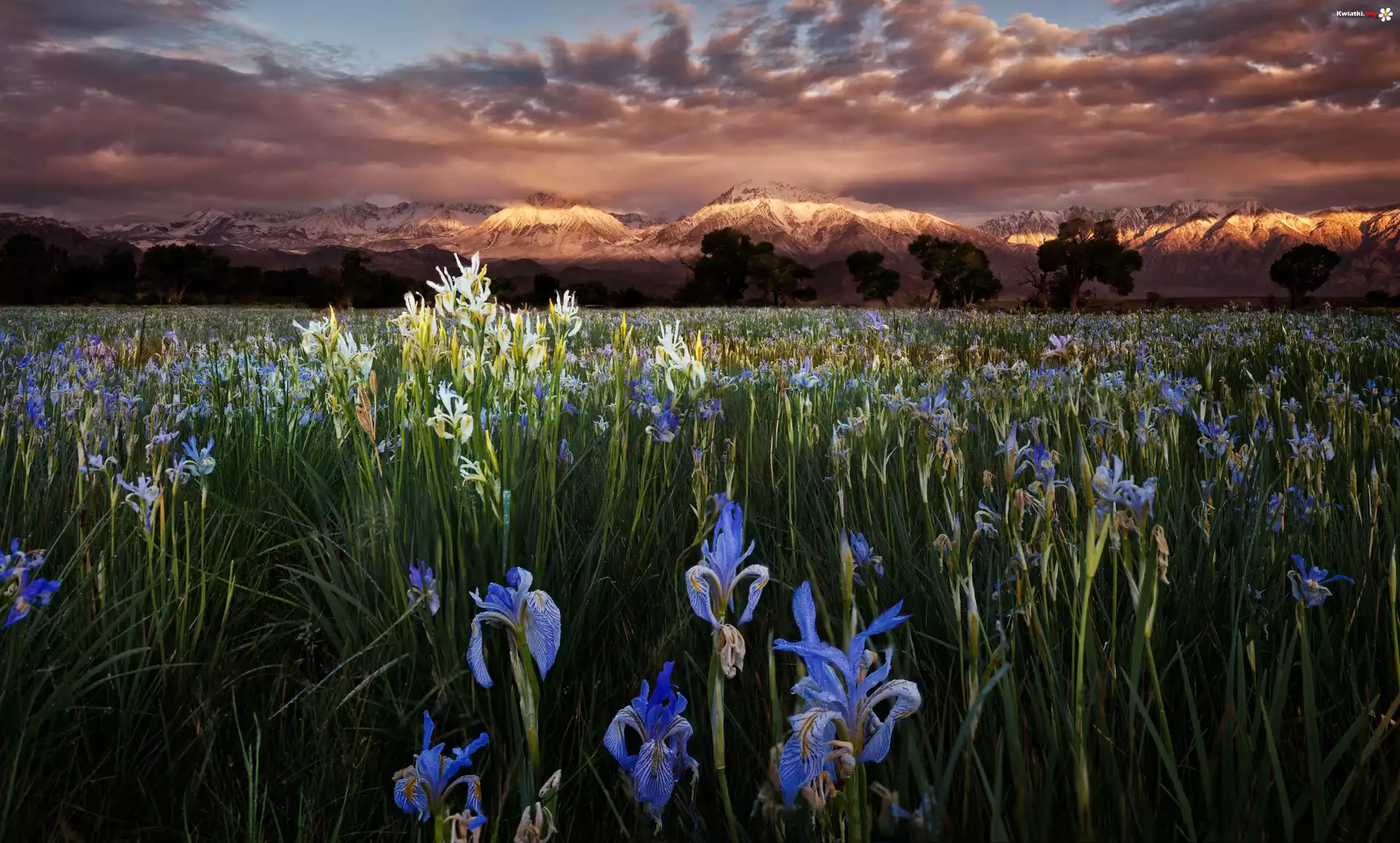 Łąka, Irysy, Góry, Światło - Zdjęcia