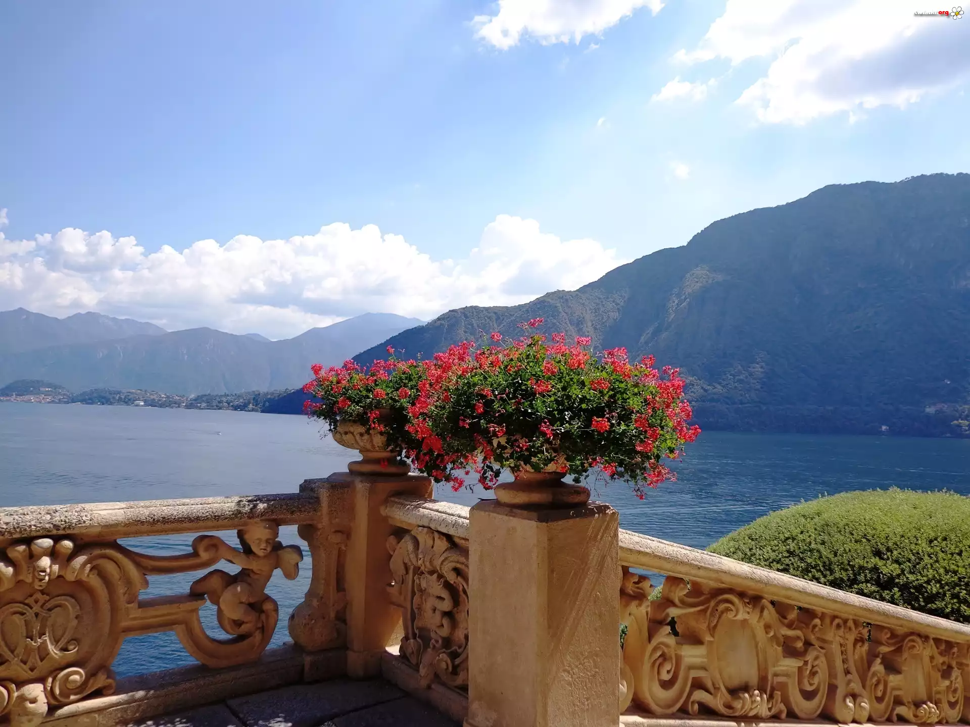 Góry, Jezioro, Como, Taras, Kwiaty, Włochy - Zdjęcia