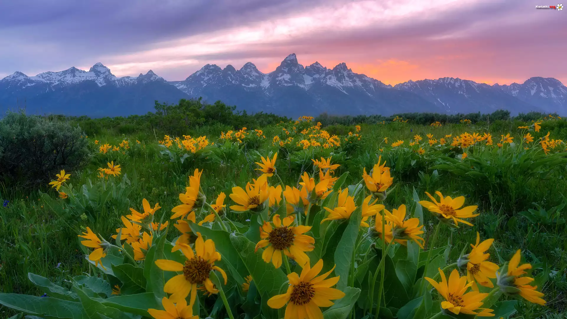 Góry, Teton Range, Wschód słońca, Żółte, Kwiaty, Balsamorhiza, Park Narodowy Grand Teton, Stan Wyoming, Stany Zjednoczone - Zdjęcia |