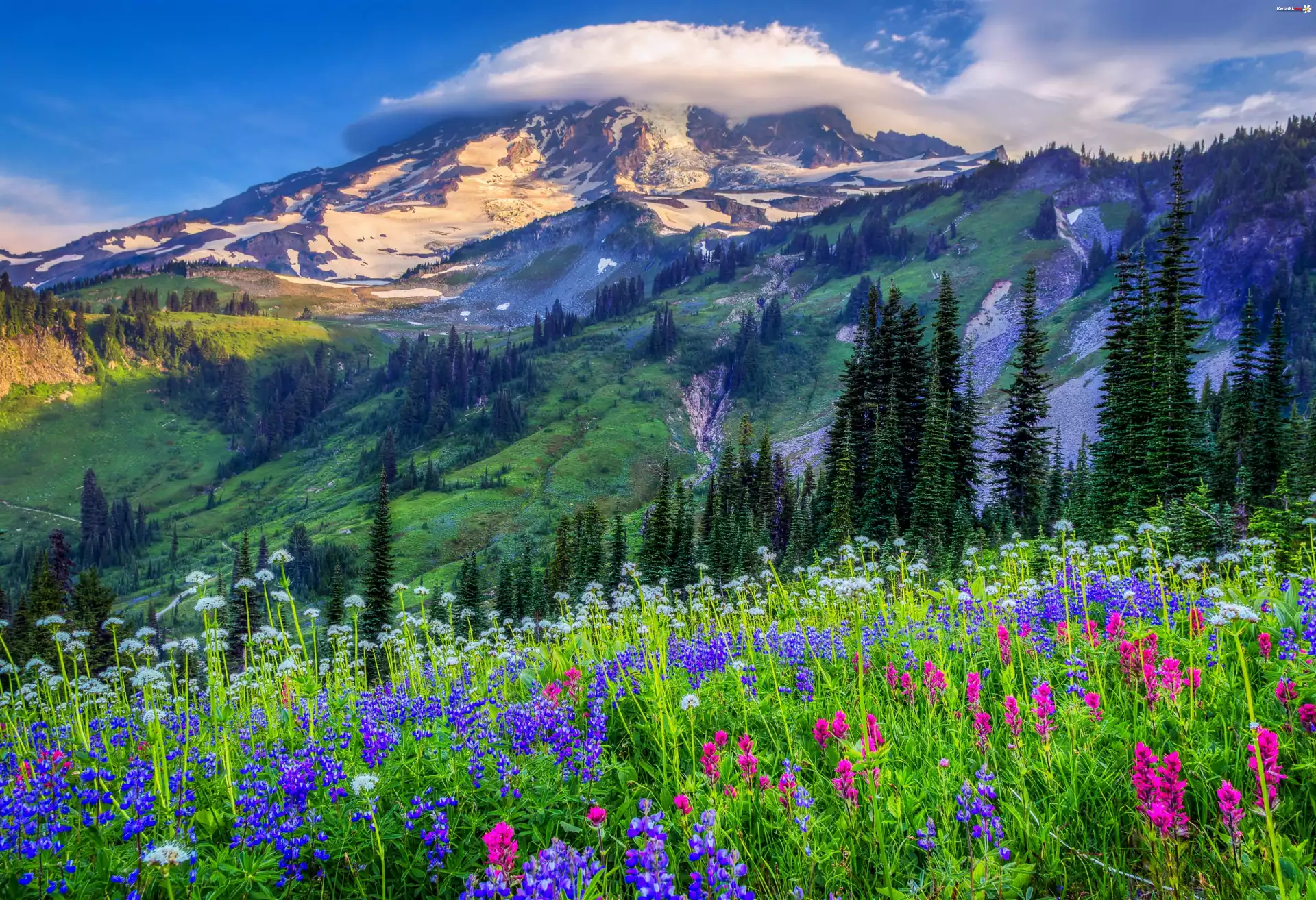 Kwiat Góry, Drzewa, Kwiaty, Łubin, Mgła