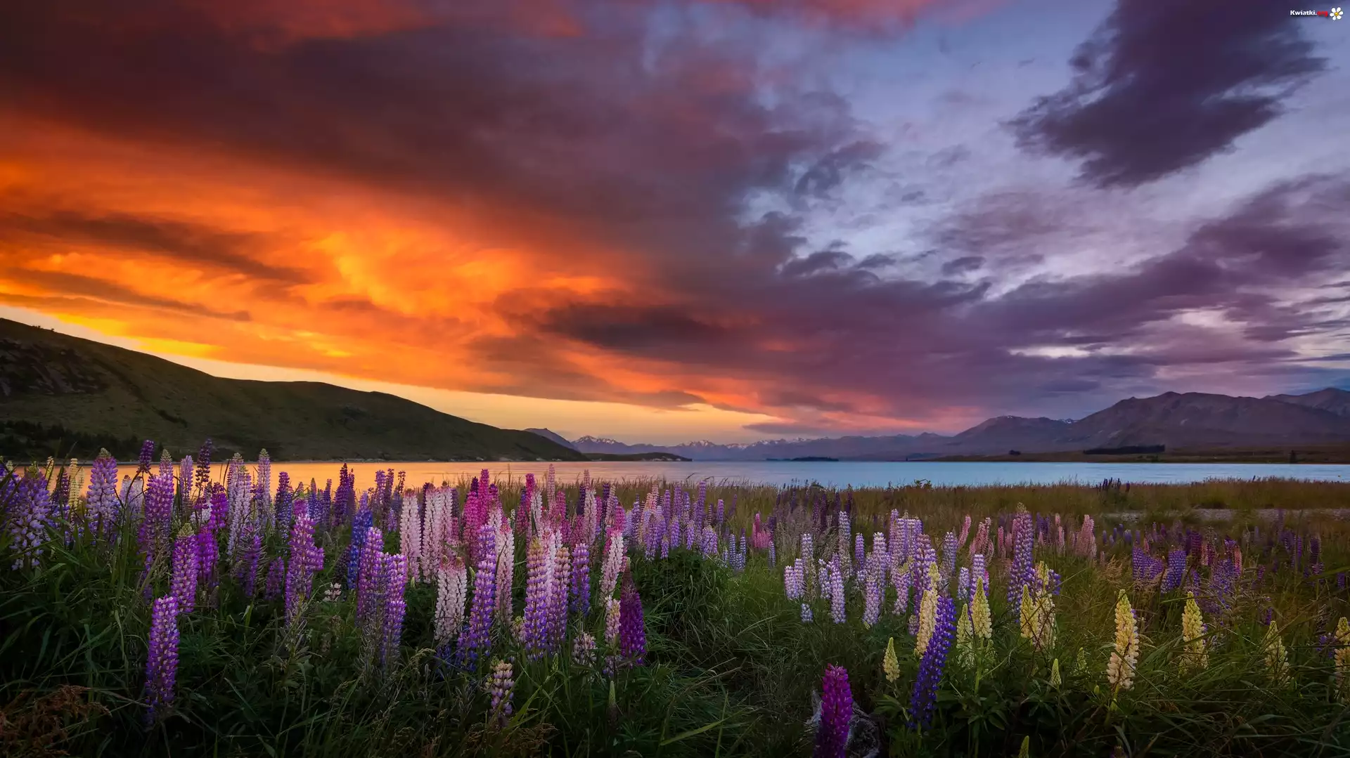 Kwiat Nowa Zelandia, Łubin, Jezioro Tekapo, Łąka, Zachód słońca, Góry
