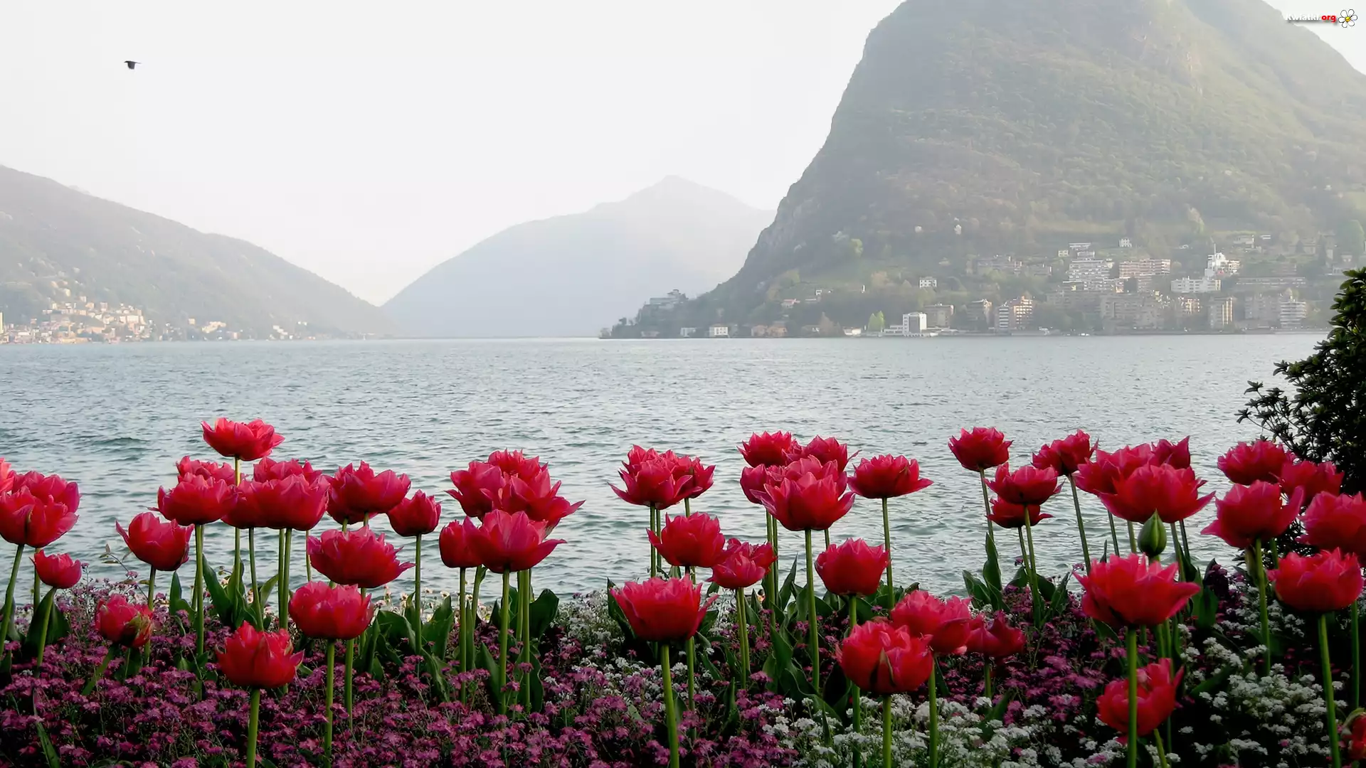 Góry, Budynki, Woda, Kwiaty - Zdjęcia