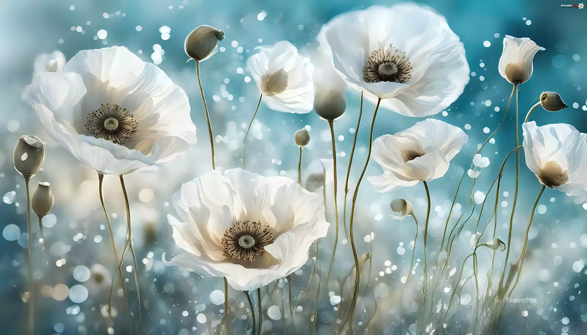 Białe, Maki, Kwiaty, Grafika - Zdjęcia