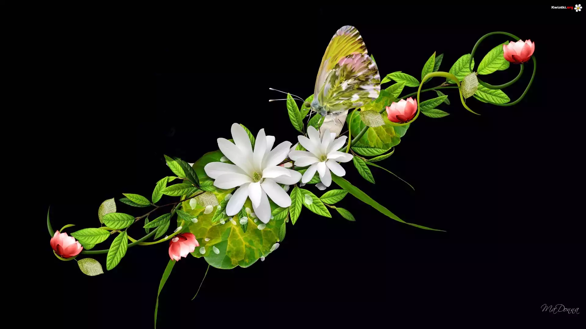 Grafika, Listki, Kwiaty, Motyl, Czarne tło - Zdjęcia