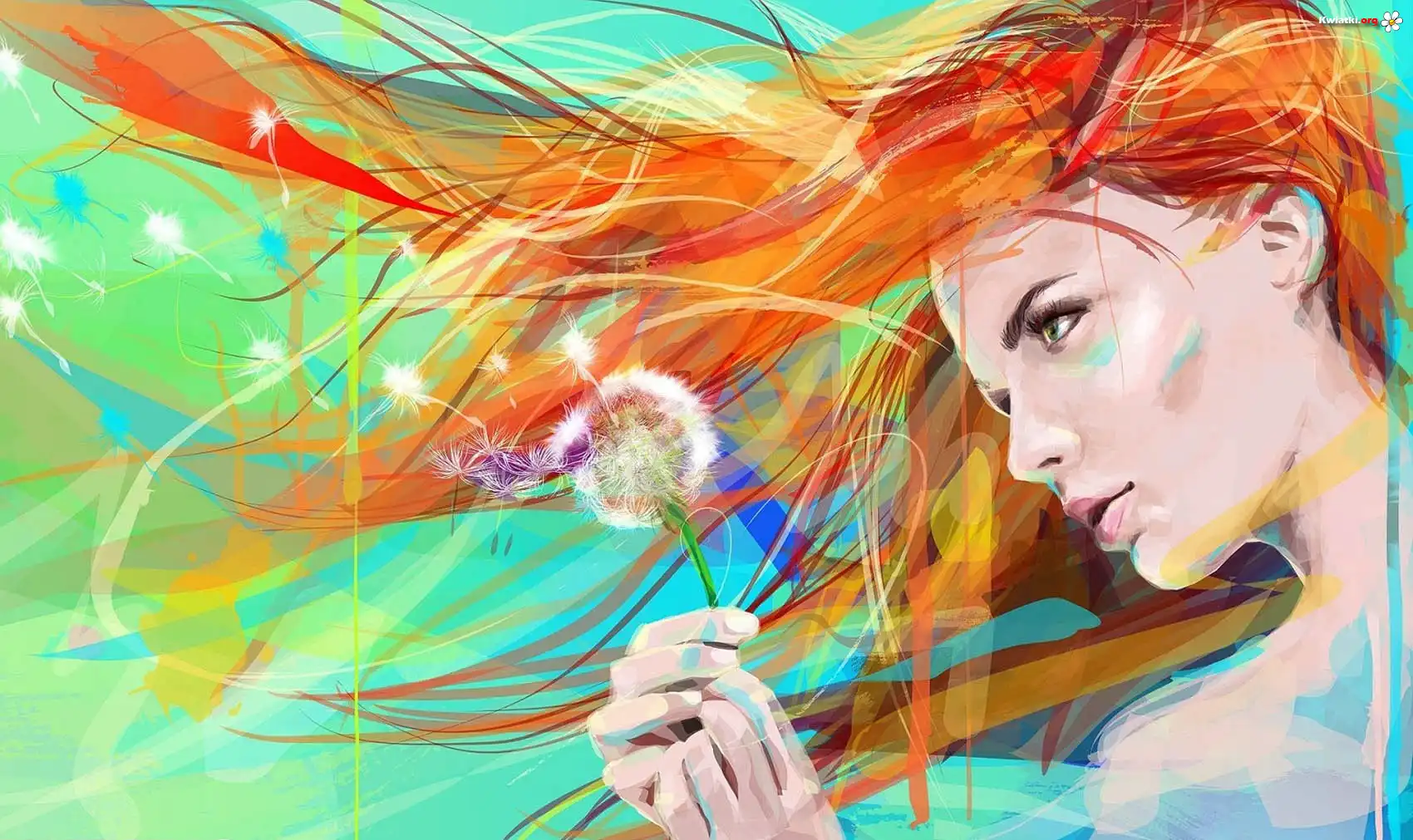 Kwiat Grafika, Art, Rudowłosa, Dziewczyna, Dmuchawiec, Mniszek