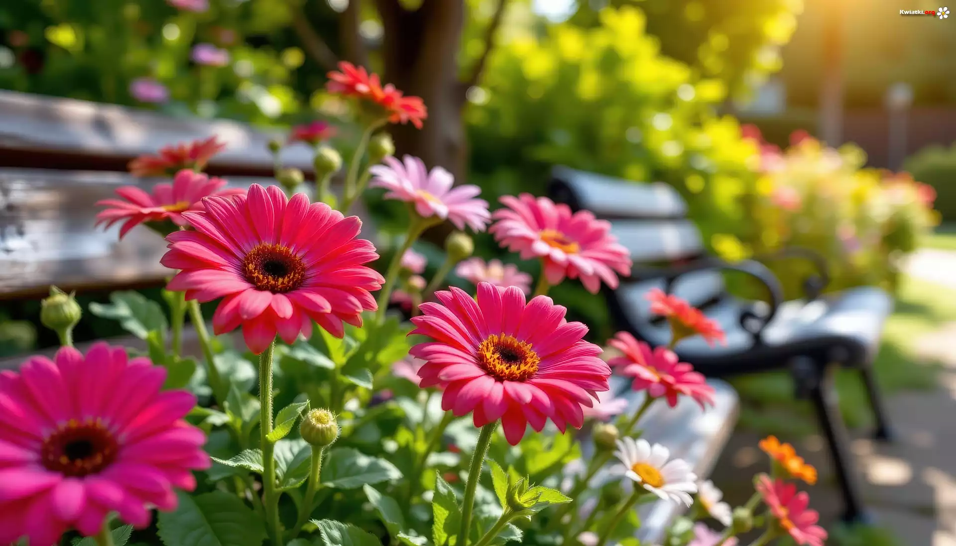 Gerbery, Kwiaty, Ławka, Grafika - Zdjęcia