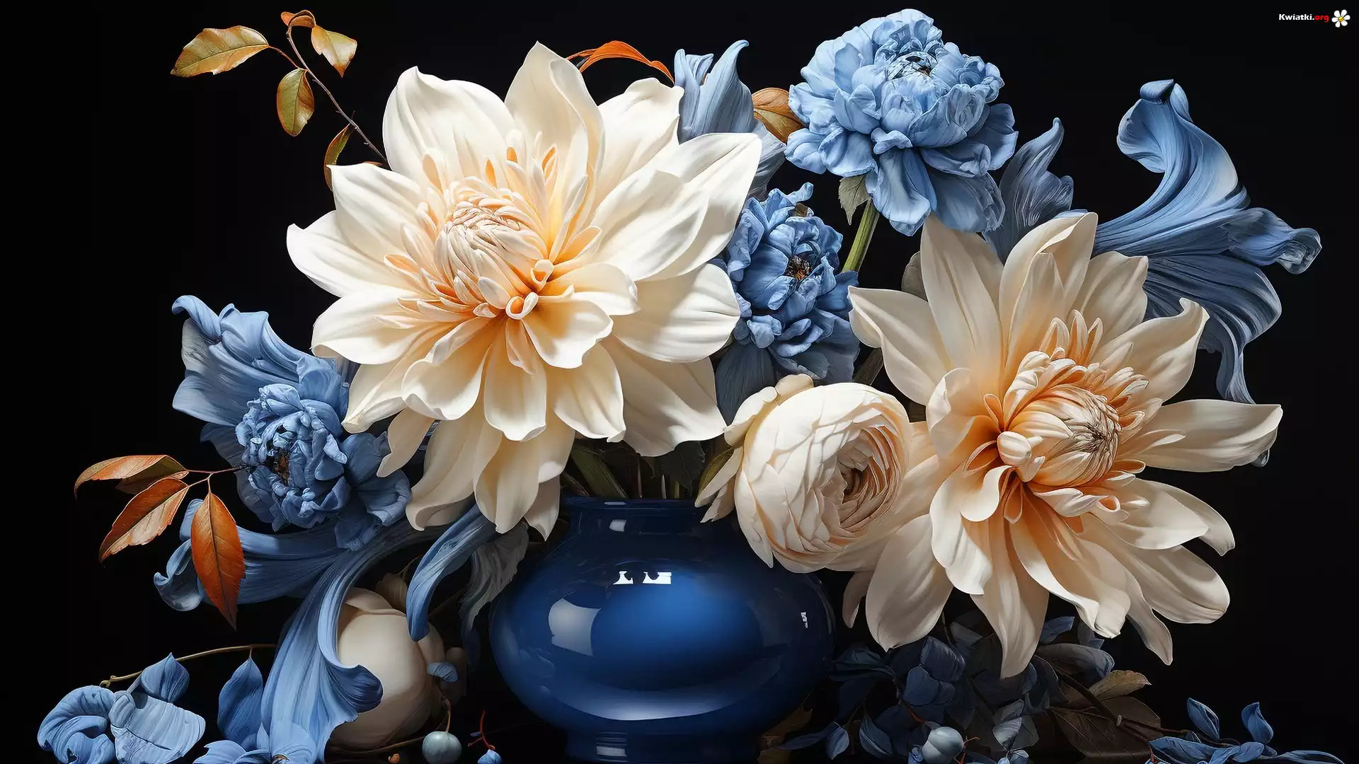 Kremowe, Niebieskie, Kwiaty, Bukiet, Liście, Niebieski, Wazon, Grafika - Zdjęcia