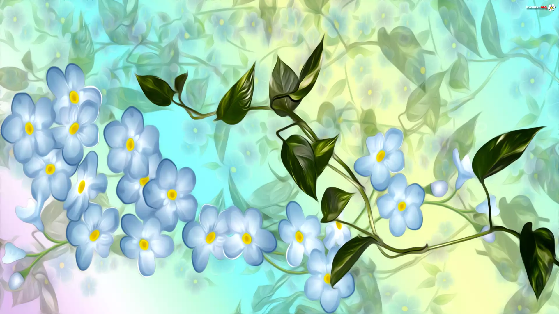 Grafika, Niebieskie, Kwiaty, Liście - Zdjęcia