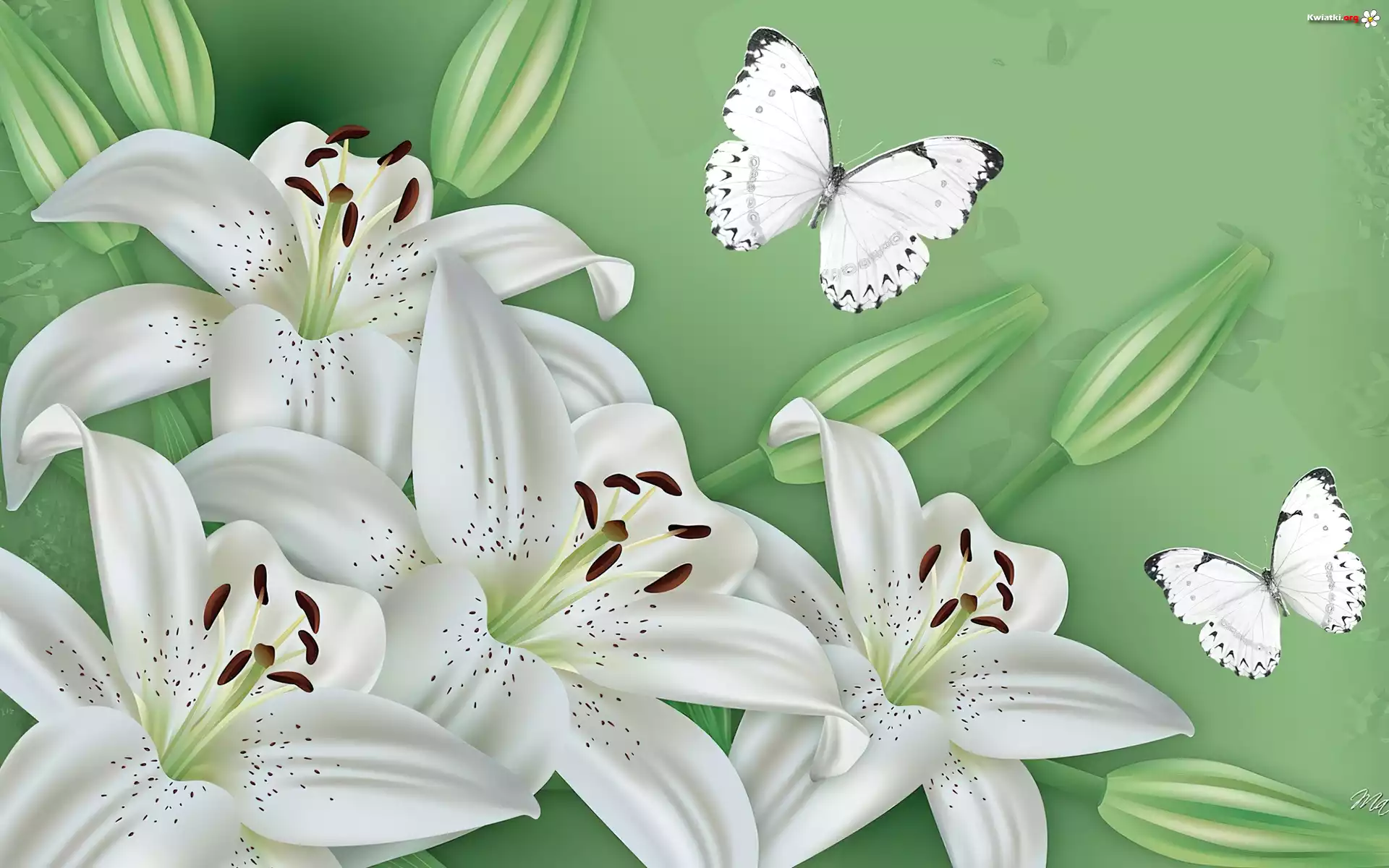 Grafika, Białe, Lilie, Motyle - Zdjęcia