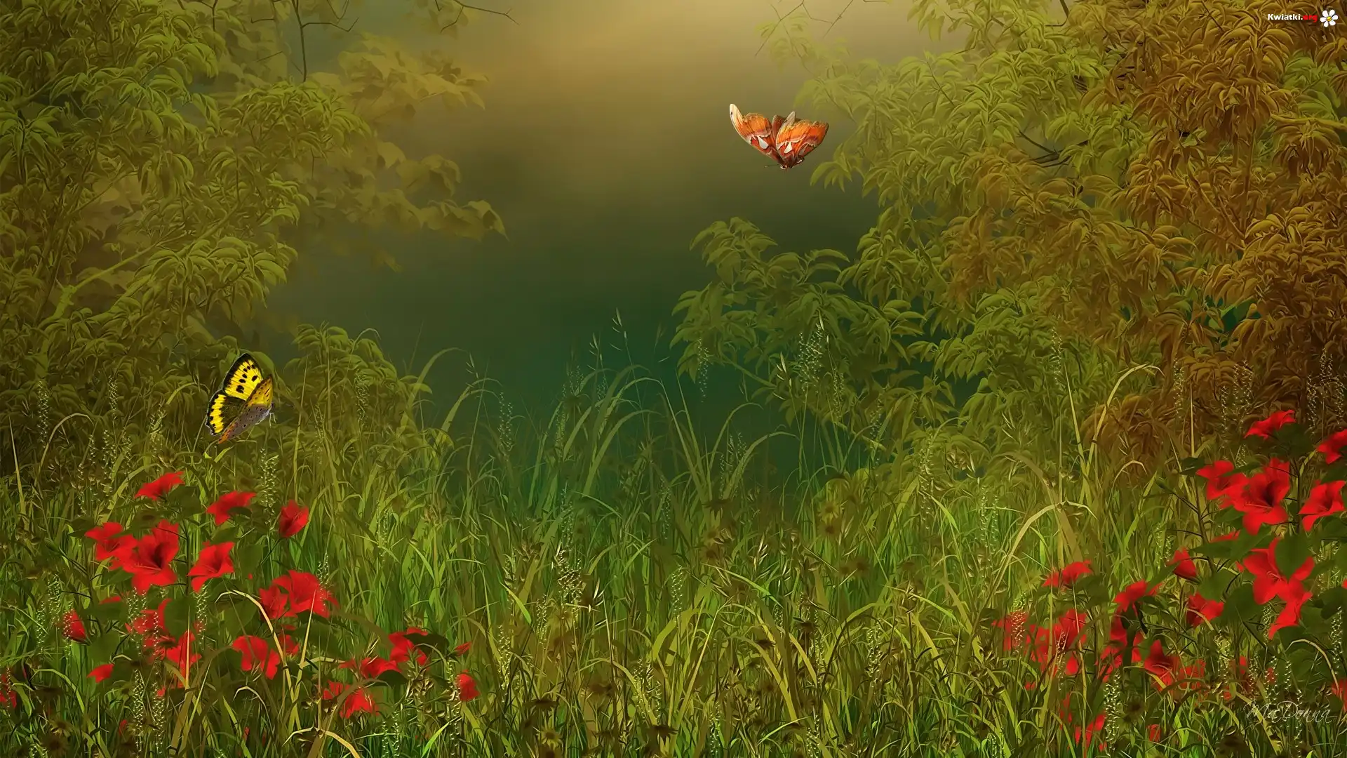 Grafika, Motyle, Lilie, Trawa - Zdjęcia