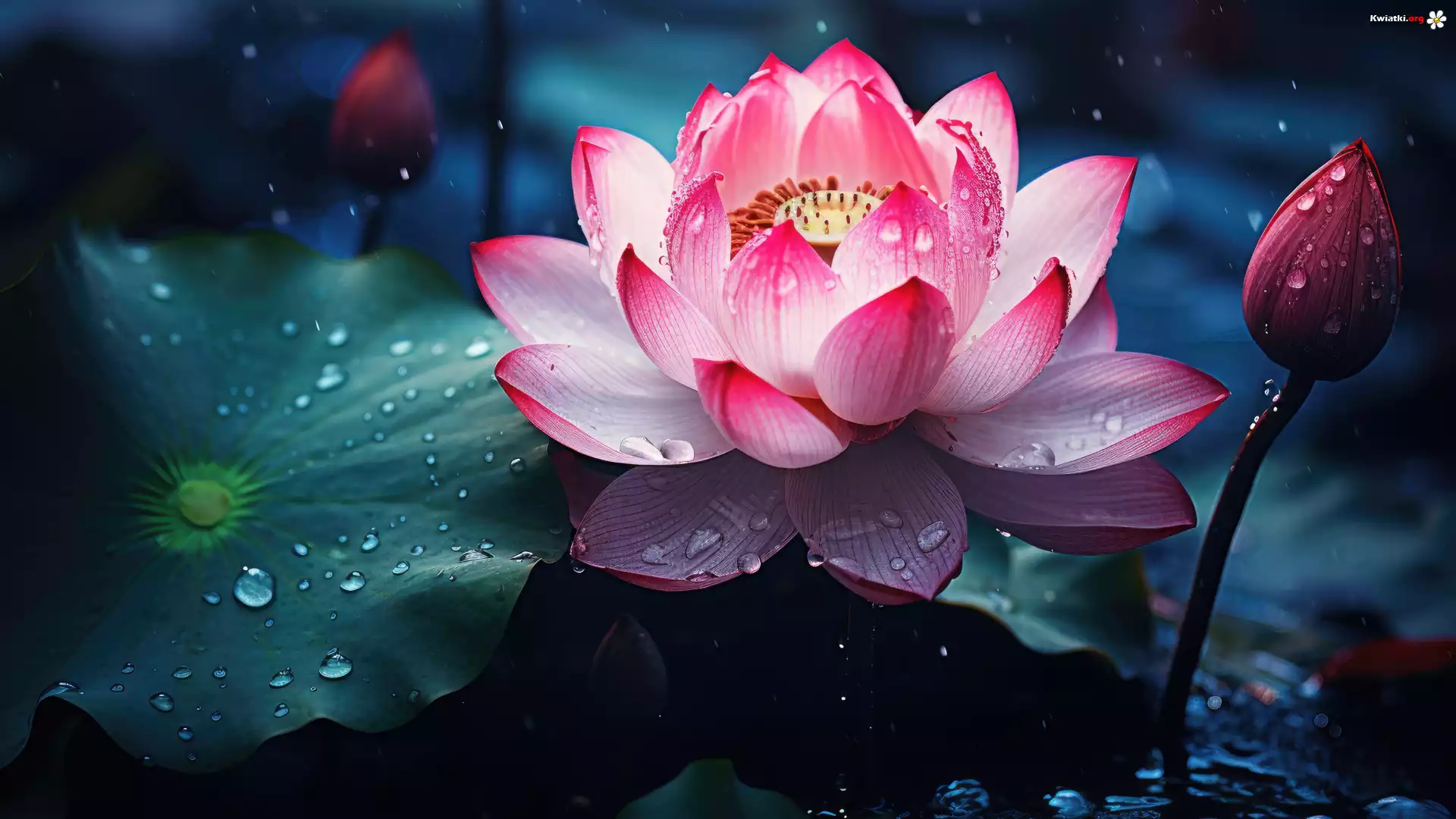 Kwiat, Rozkwitnięty, Lotos, Pąki, Liście, Krople, Wody, Grafika - Zdjęcia