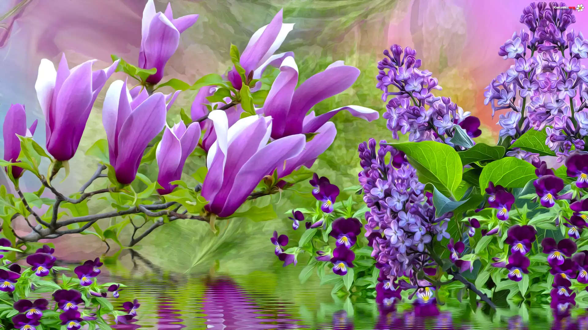 Grafika, Wiosenne, Kwiaty, Bez, Magnolia, Bratki - Zdjęcia