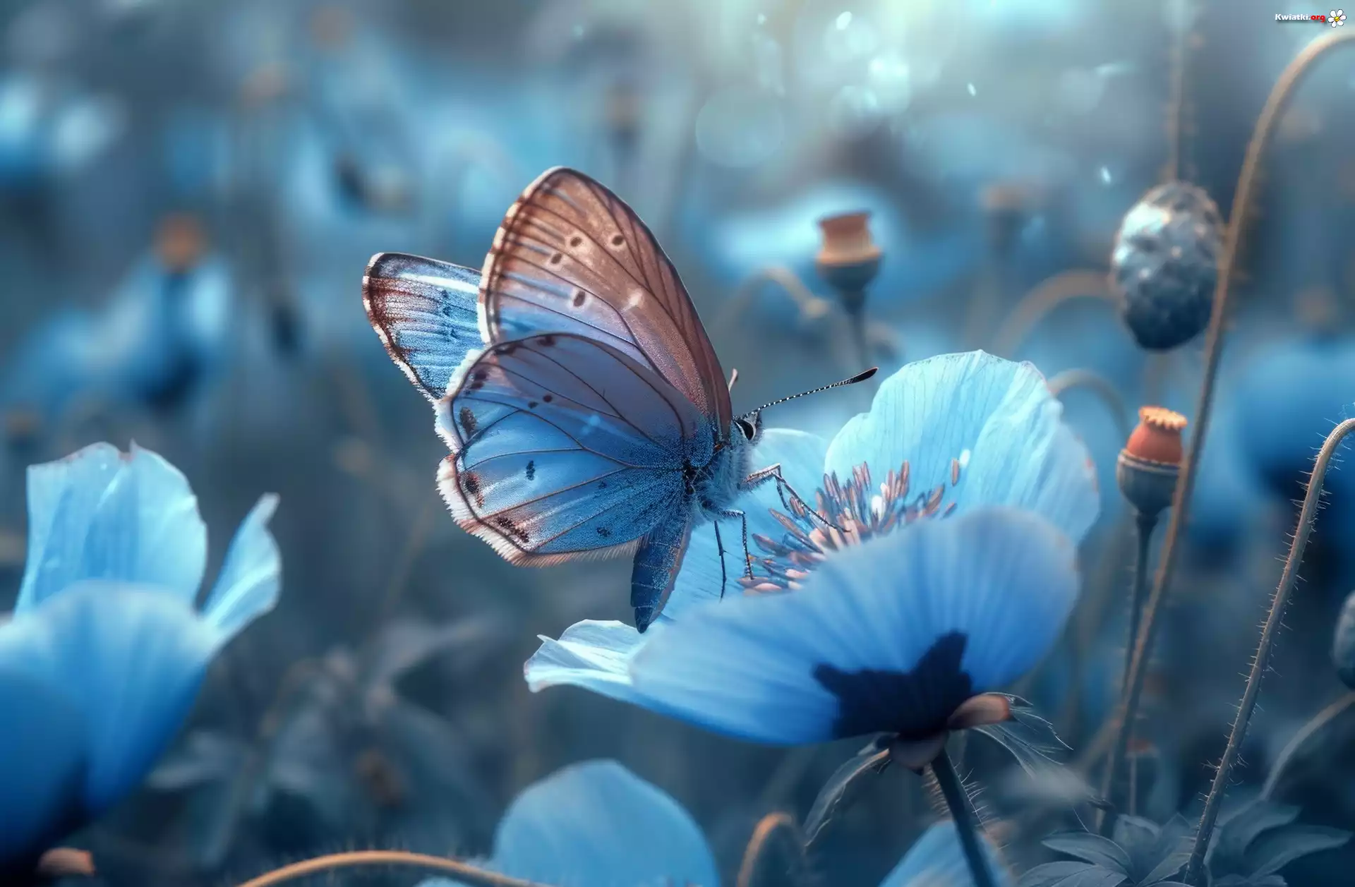Motyl, Niebieskie, Kwiaty, Grafika - Zdjęcia