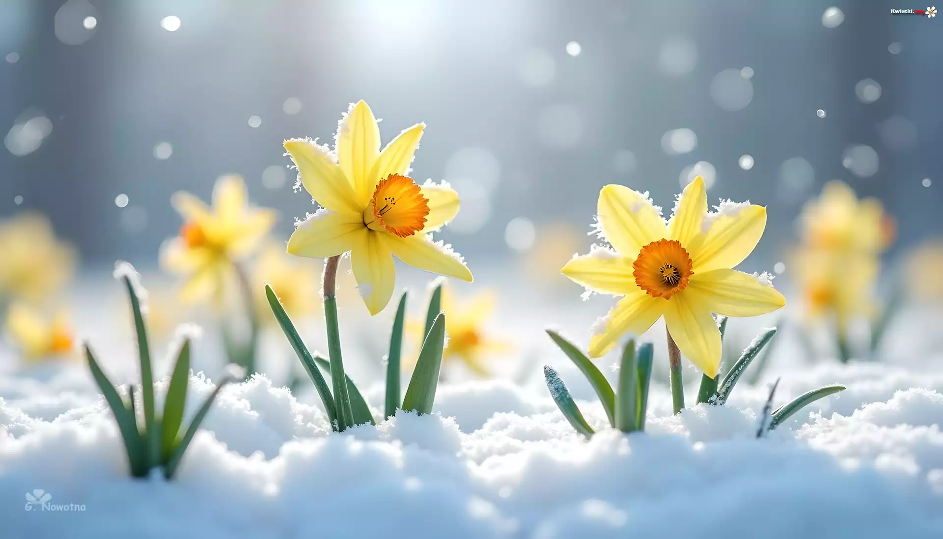 Narcyzy, Kwiaty, Śnieg, Grafika - Zdjęcia