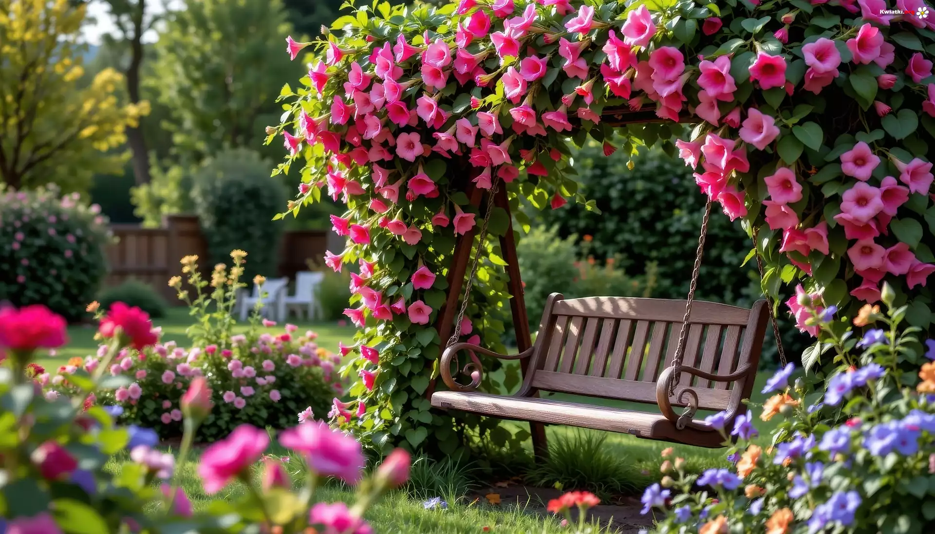 Ogród, Ławka, Kwiaty, Grafika - Zdjęcia
