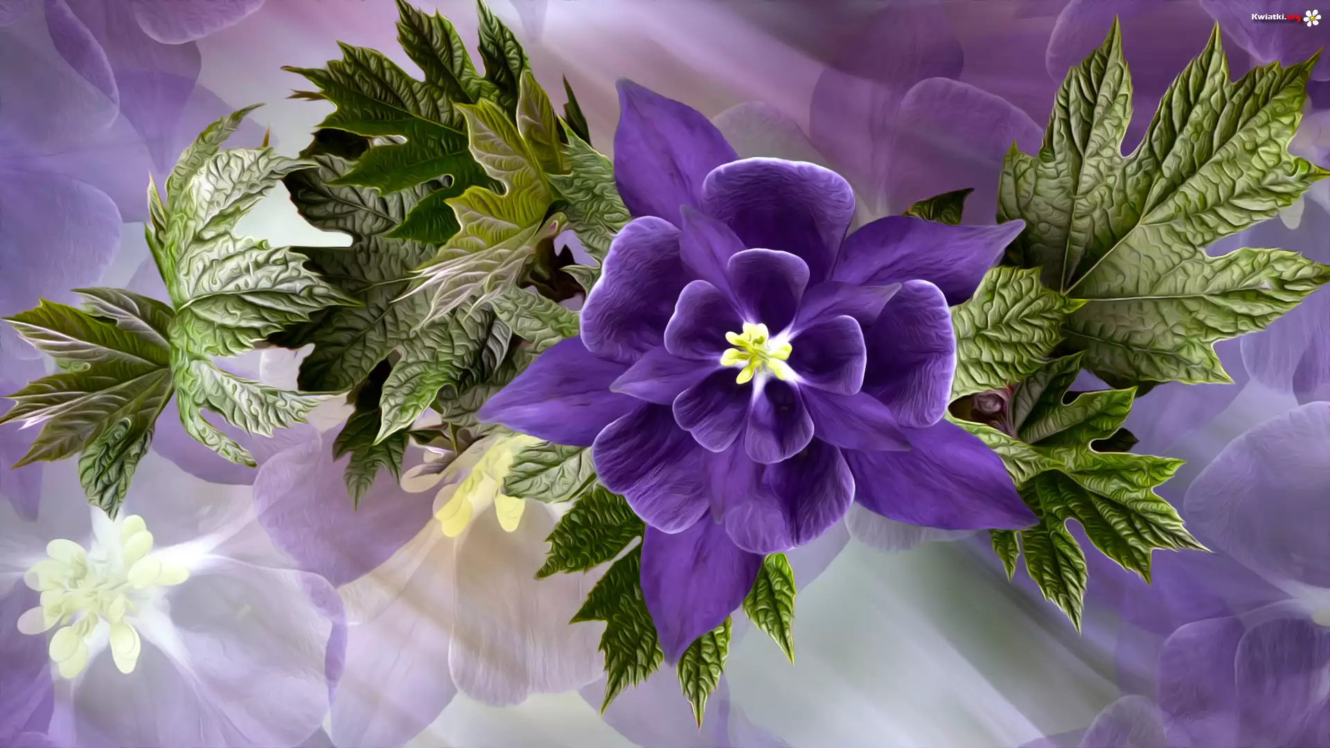 Grafika, Kwiat, Fioletowy, Orlik, Liście - Zdjęcia