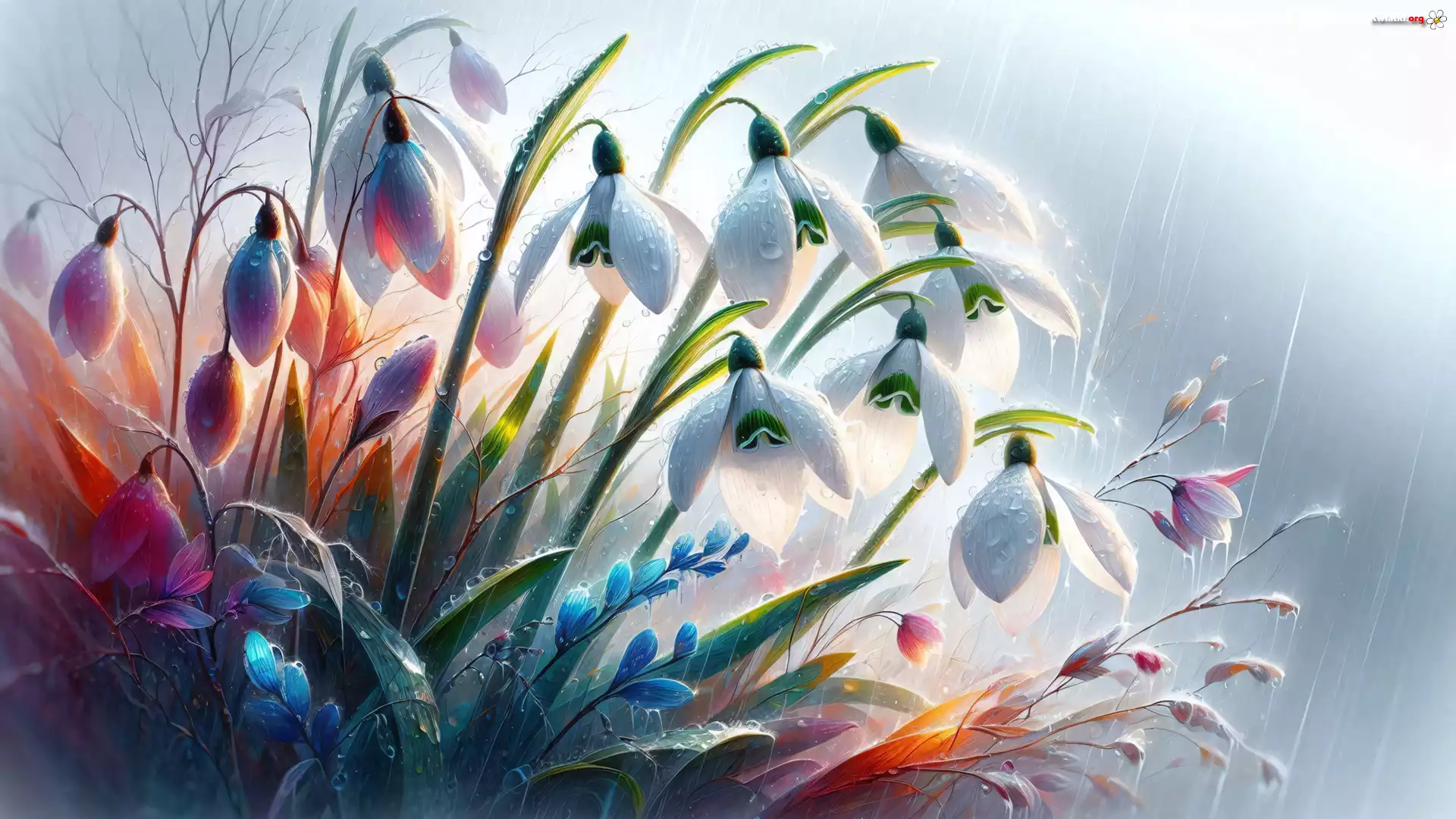Kwiat Przebiśniegi, Kwiaty, Krople, Grafika
