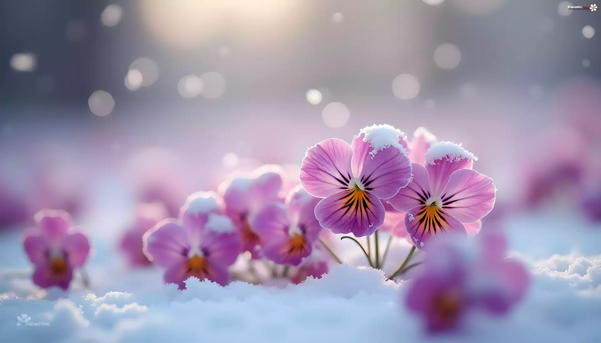 Różowe, Bratki, Śnieg, Grafika - Zdjęcia