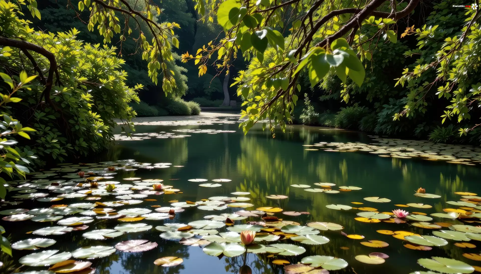 Staw, Lilie wodne, Zwisające, Gałęzie, Drzewa, Lato, Grafika - Zdjęcia