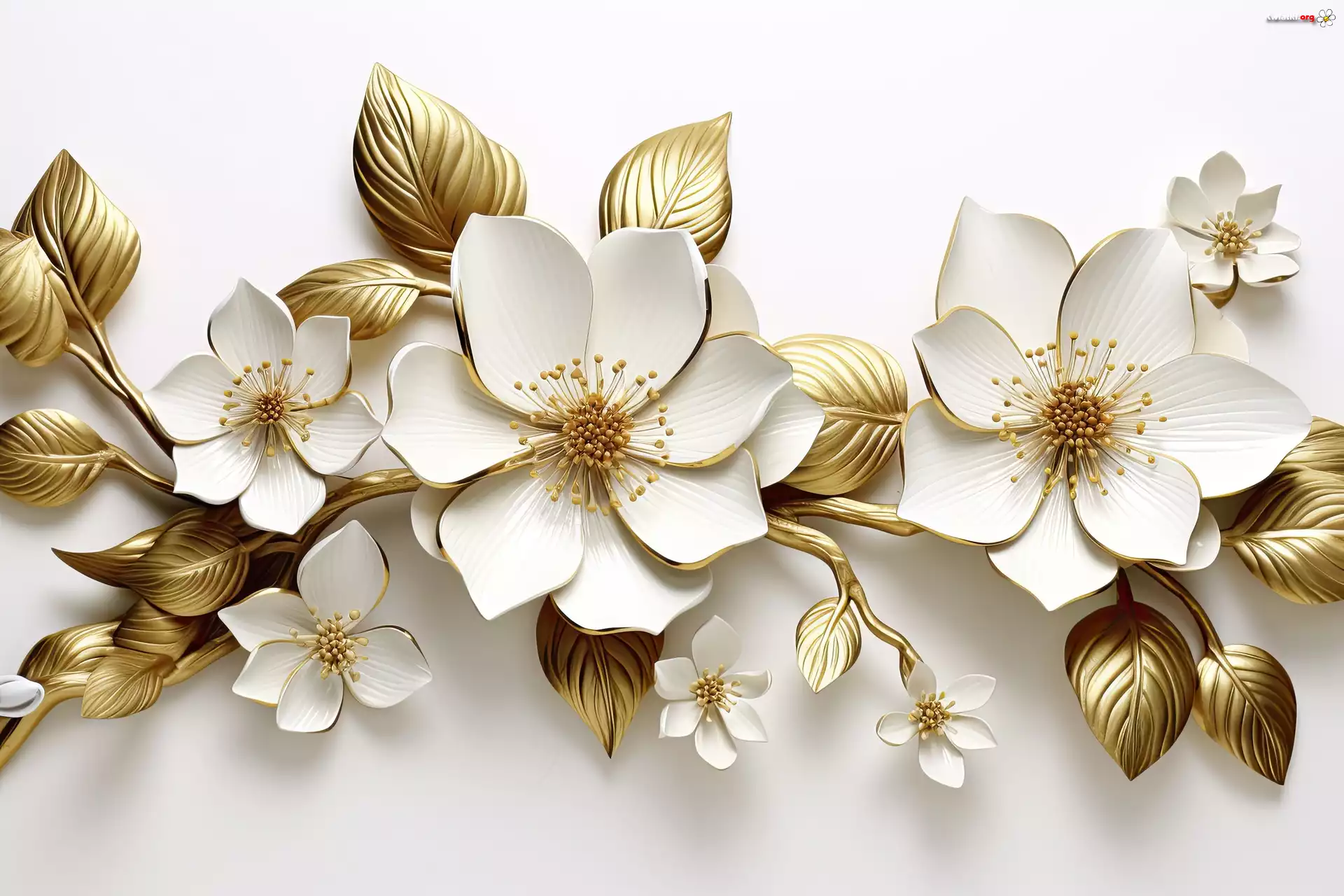 Białe, Kwiaty, Złote, Listki, Gałązki, Białe, Tło, Grafika - Zdjęcia