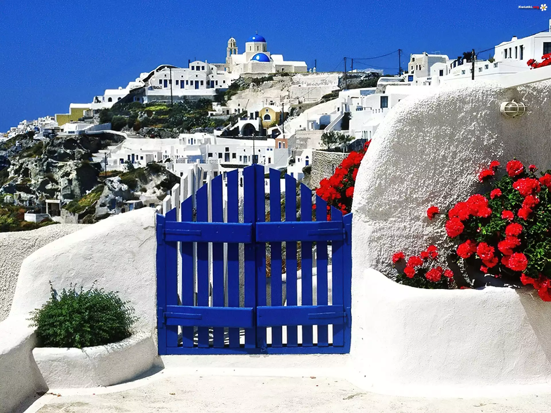 Grecja, Miasto, Niebieska, Brama, Kwiaty - Zdjęcia