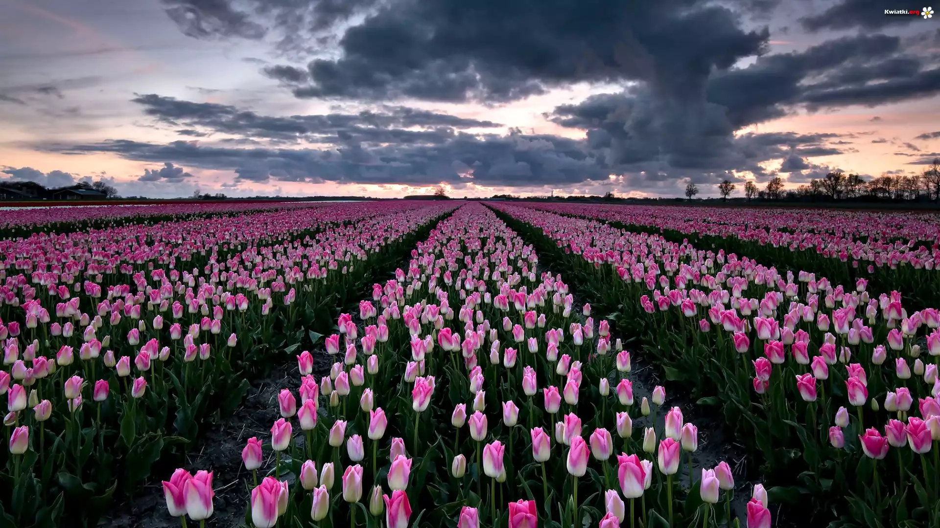 Holandia, Groningen, Biało-różowe, Tulipany, Pole, Niebo, Chmury - Zdjęcia