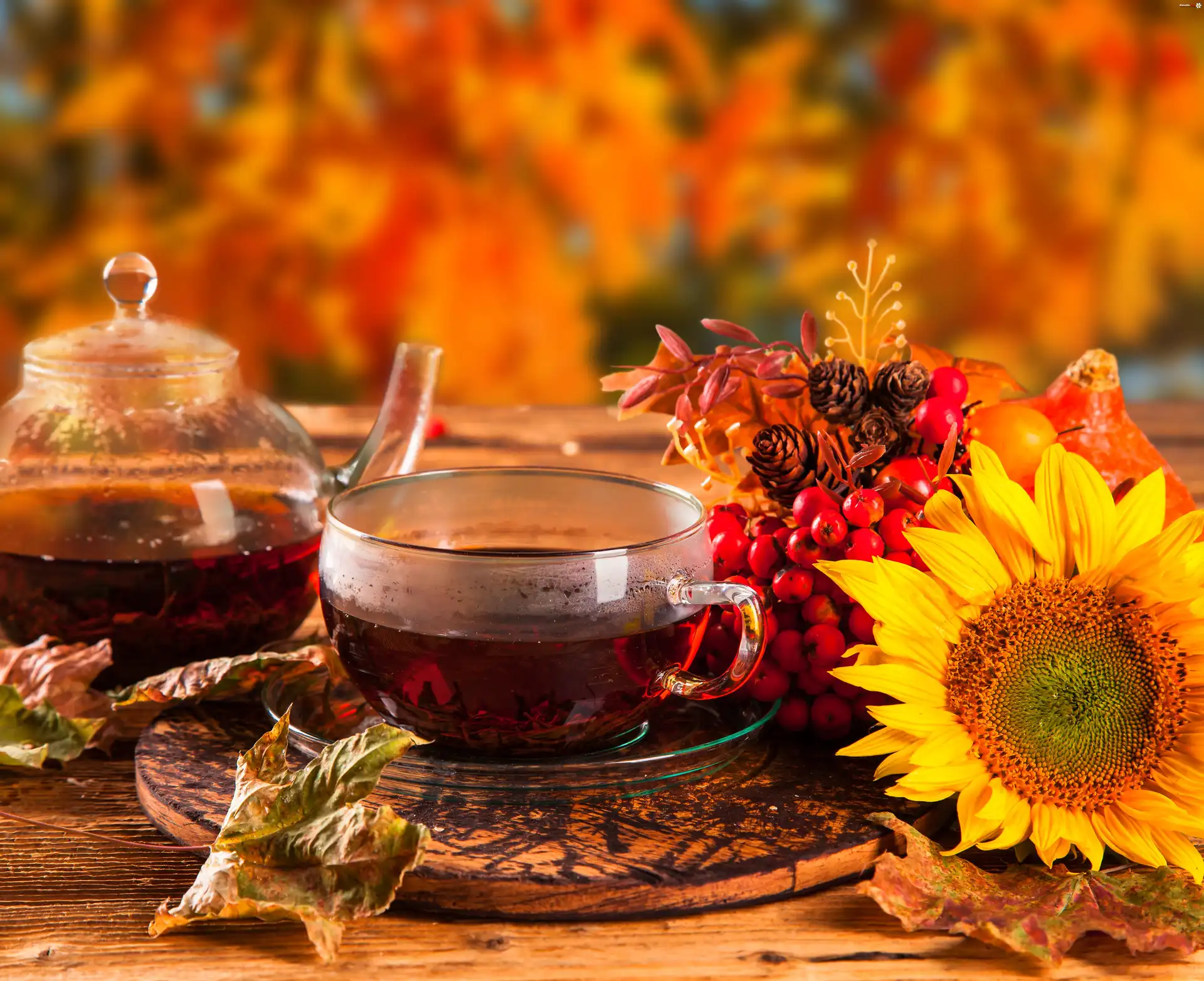 Kwiat Kompozycja, Herbata, Filiżanka, Czajniczek, Słonecznik, Jarzębina, Liście