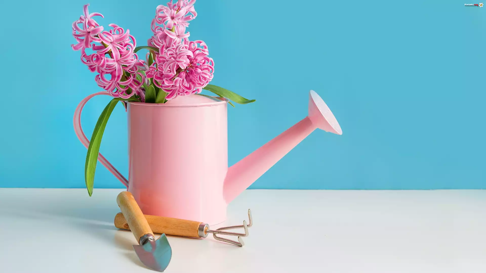 Różowe, Hiacynty, Konewka, Grabki, Łopatka, Niebieskie, Tło - Zdjęcia