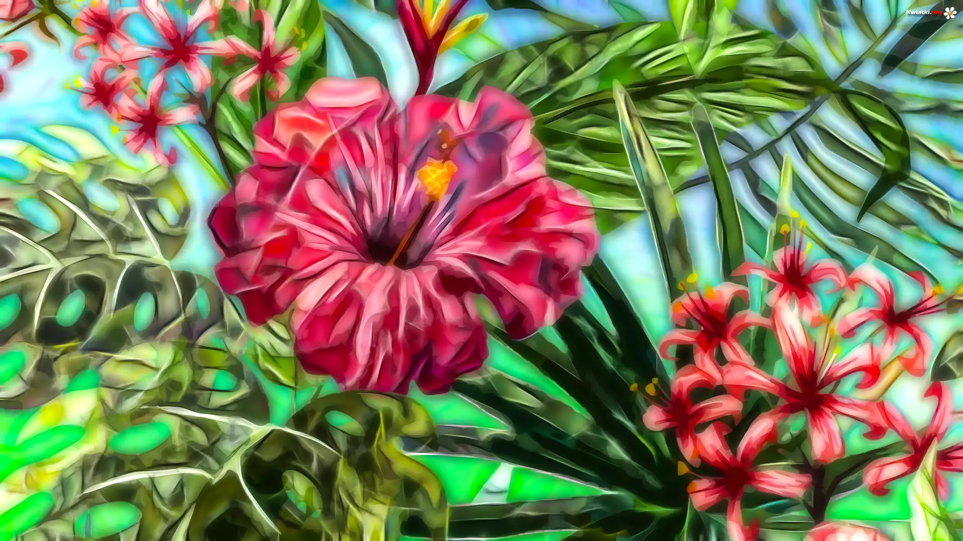 Kwiaty, Liście, Grafika, Hibiskus - Zdjęcia