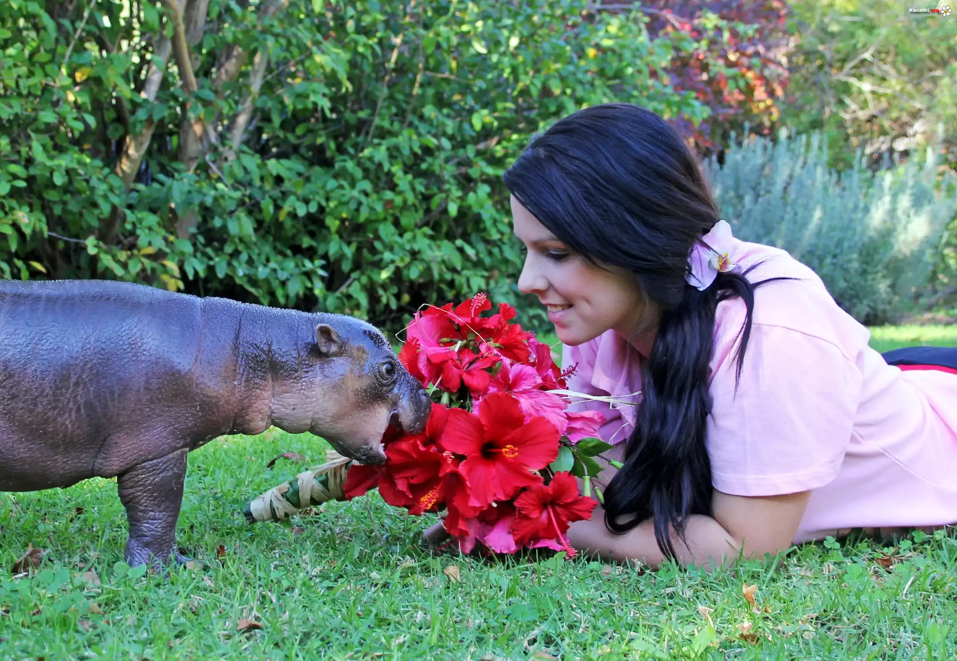 Hipopotam, Trawa Kobieta, Czerwone, Kwiaty - Zdjęcia