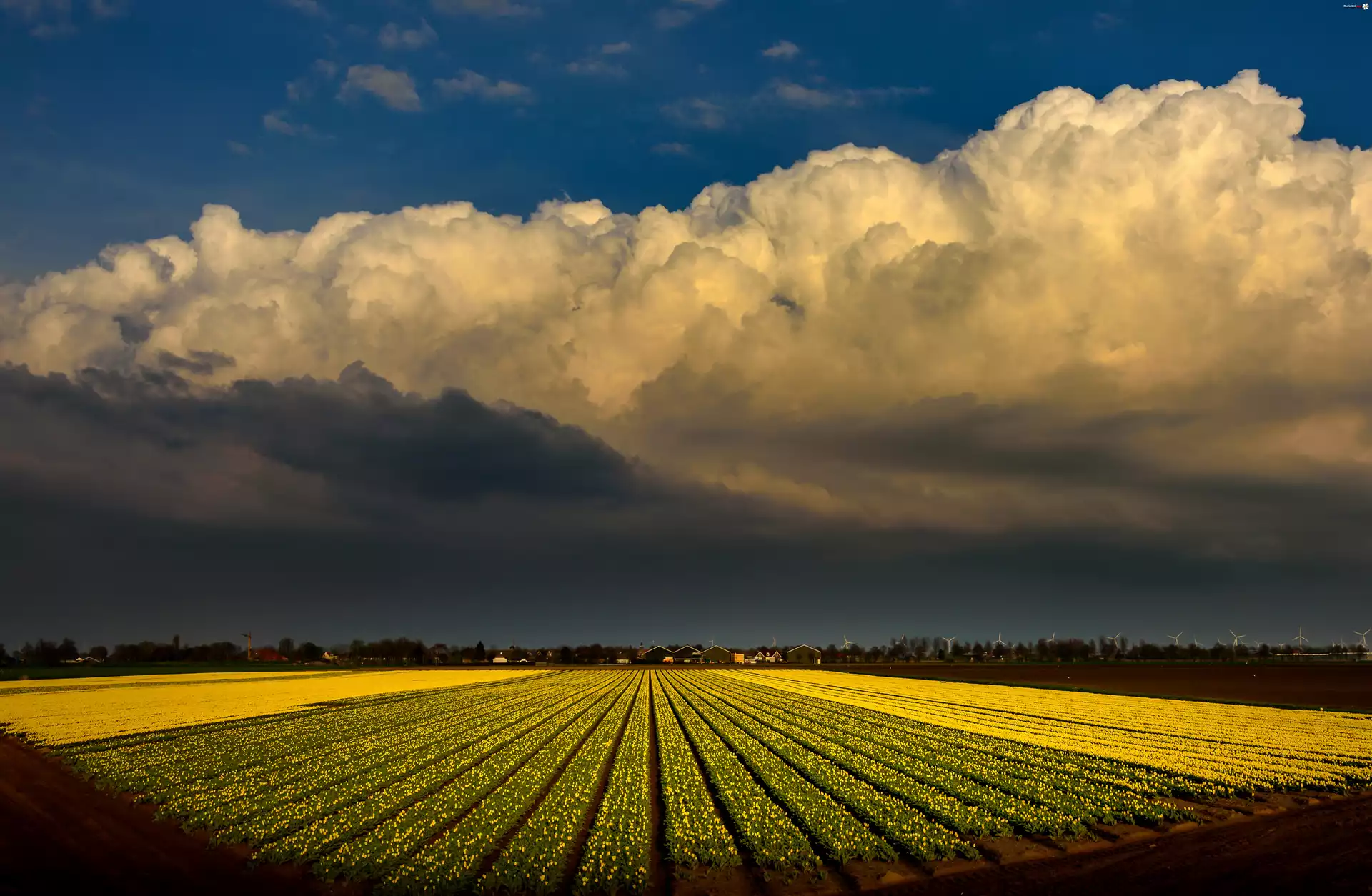 Kwiat Holandia, Pole, Żółte, Tulipany, Chmury