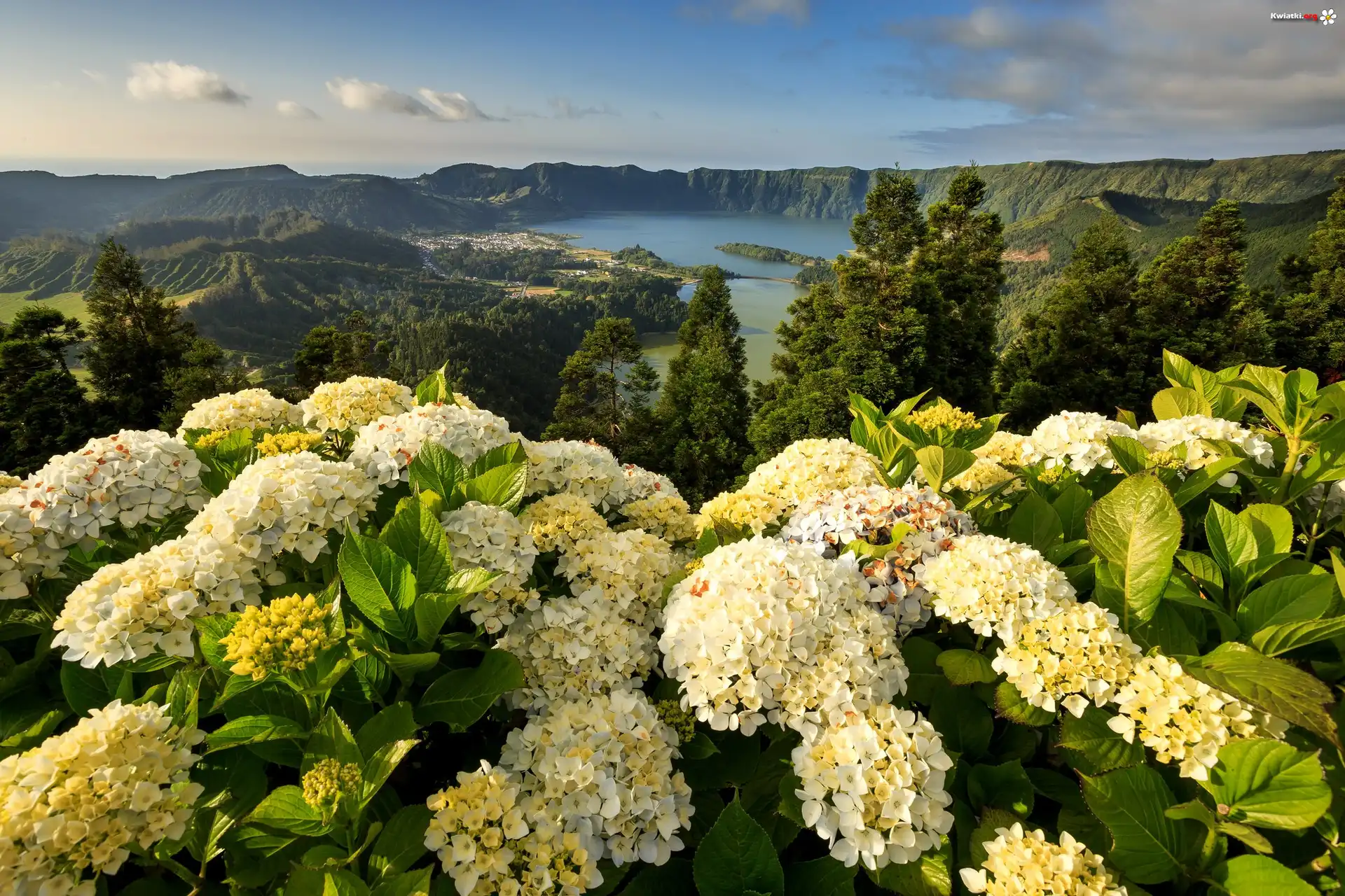 Kwiat Hortensje, Góry, Jezioro, Azory, Portugalia