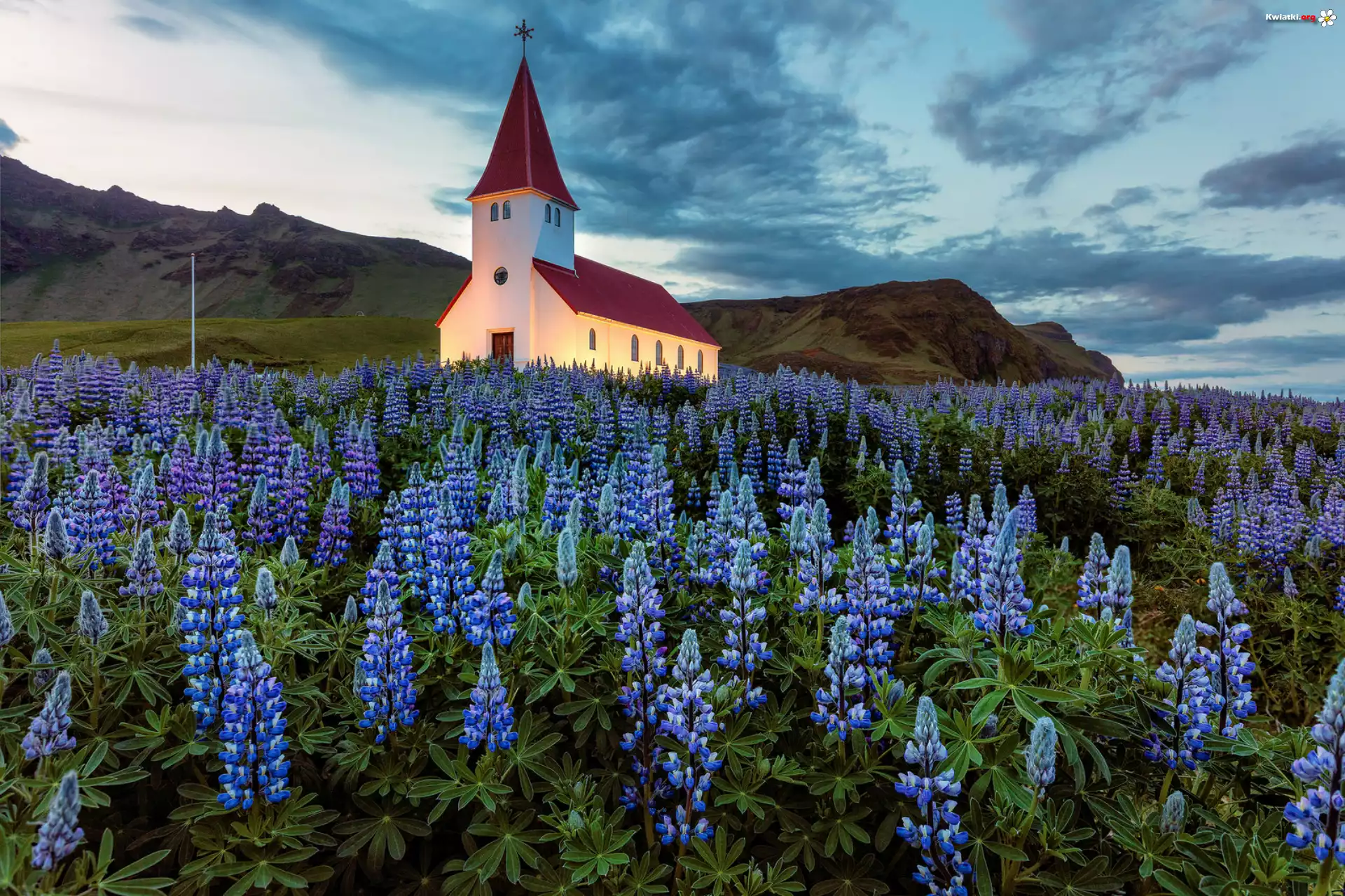 Kościół, Łąka, Łubin, Góry, Miejscowość Vik i Myrdal, Gmina Myrdalshreppur, Islandia - Zdjęcia