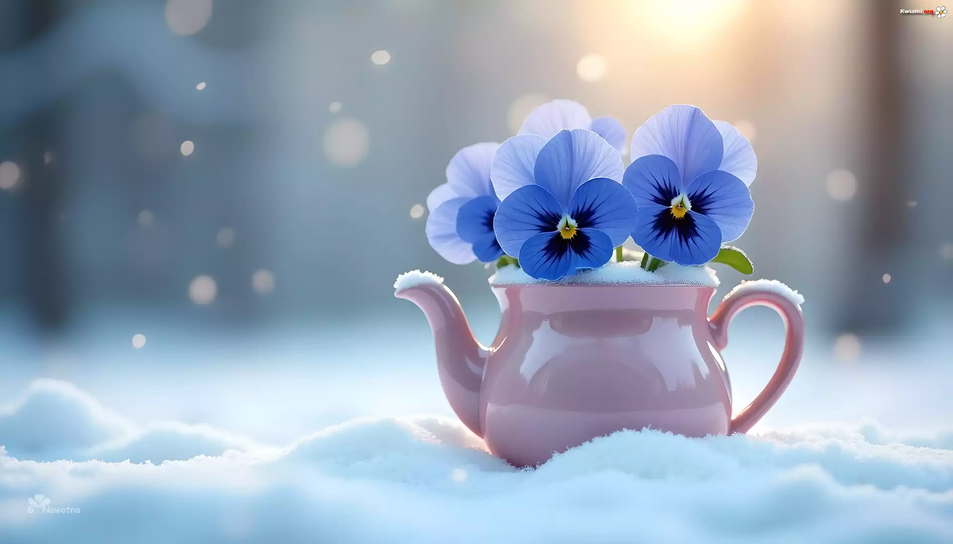 Niebieskie, Bratki, Kwiaty, Imbryk, Śnieg, Grafika - Zdjęcia