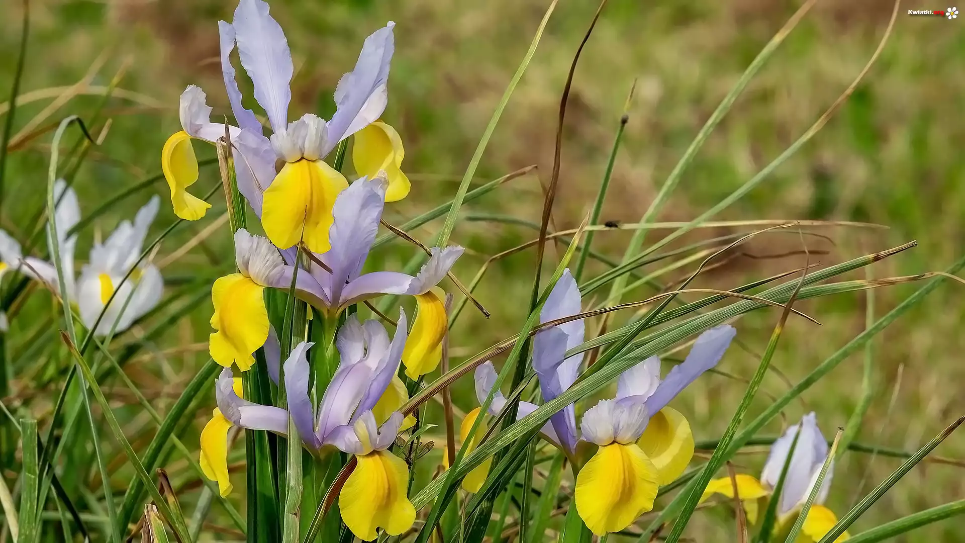 Kwiaty, Irysy, Trawa - Zdjęcia