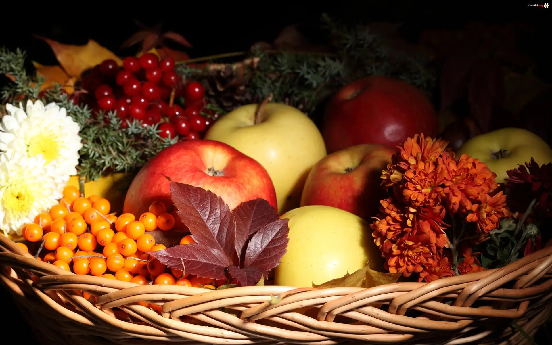 Jabłka, Kwiaty, Liście, Kosz, Kompozycja - Zdjęcia
