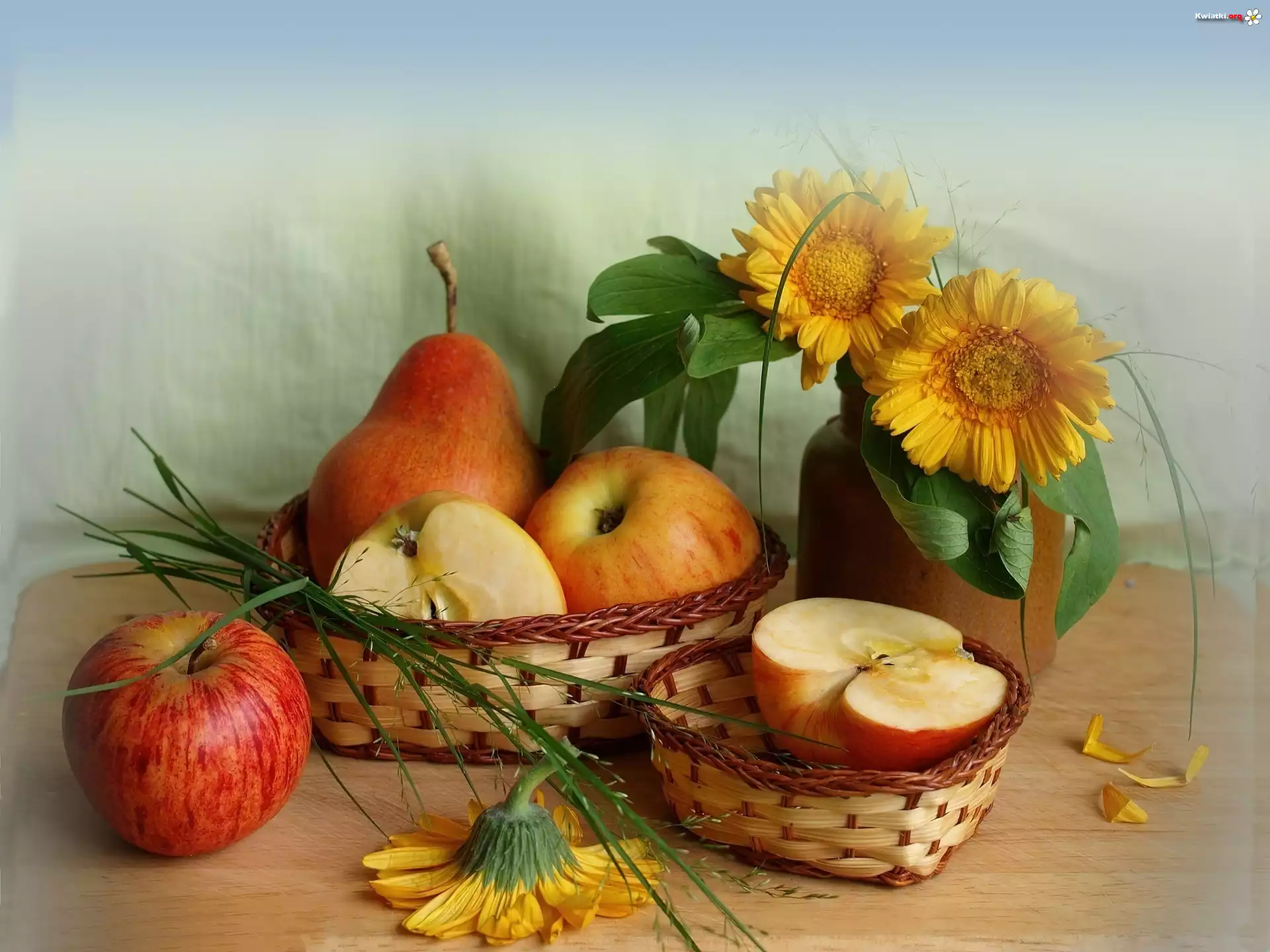 Jabłka, Gruszki, Żółte, Gerbery - Zdjęcia