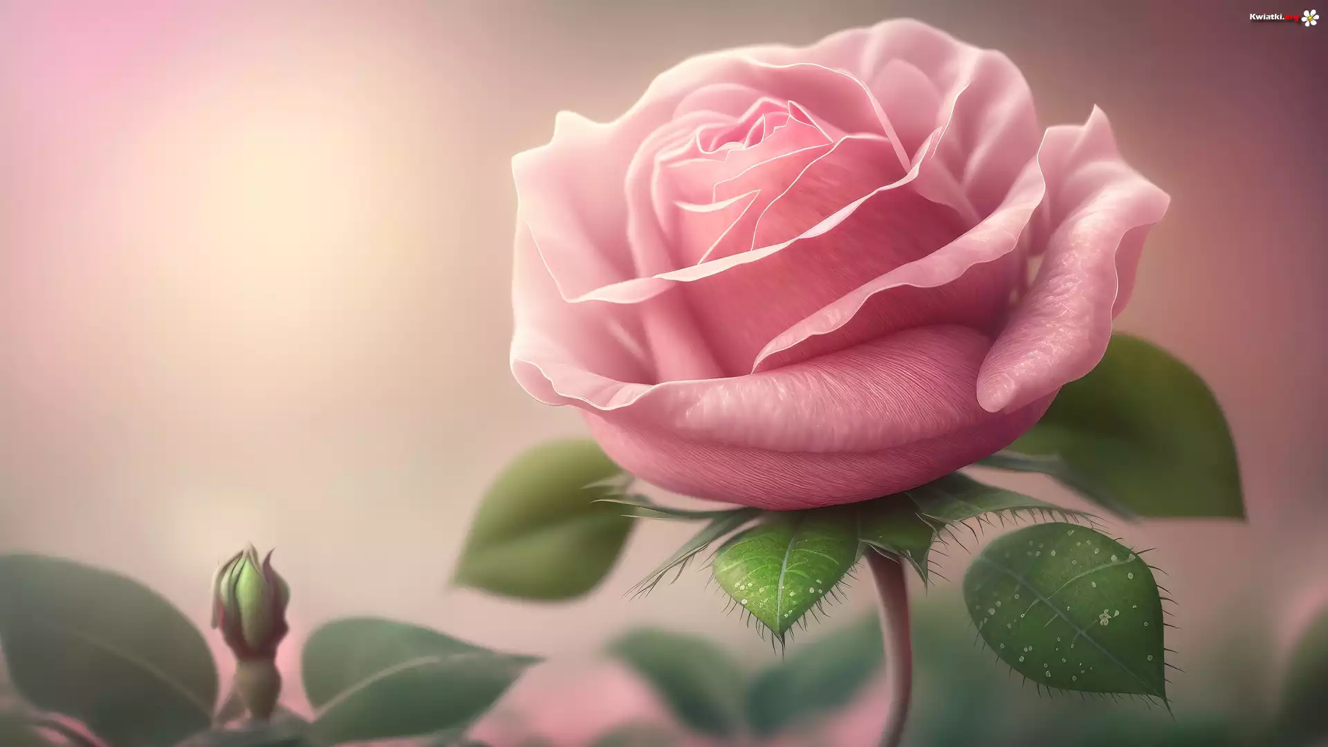 Kwiat Róża, Jasnoróżowa, Pąk, Liście, AI