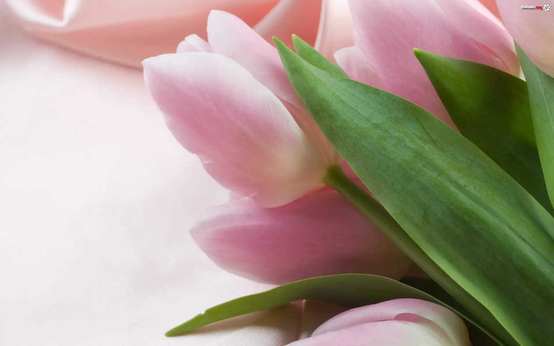 Jasnoróżowe, Tulipany, Zielone, Liście - Zdjęcia