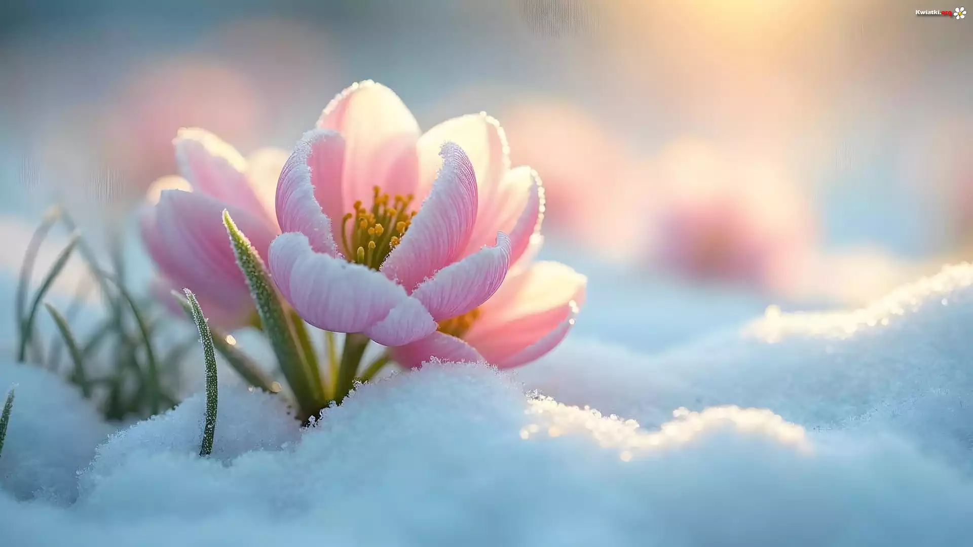 Kwiat Kwiaty, Jasnoróżowe, Zima, Śnieg, Światło