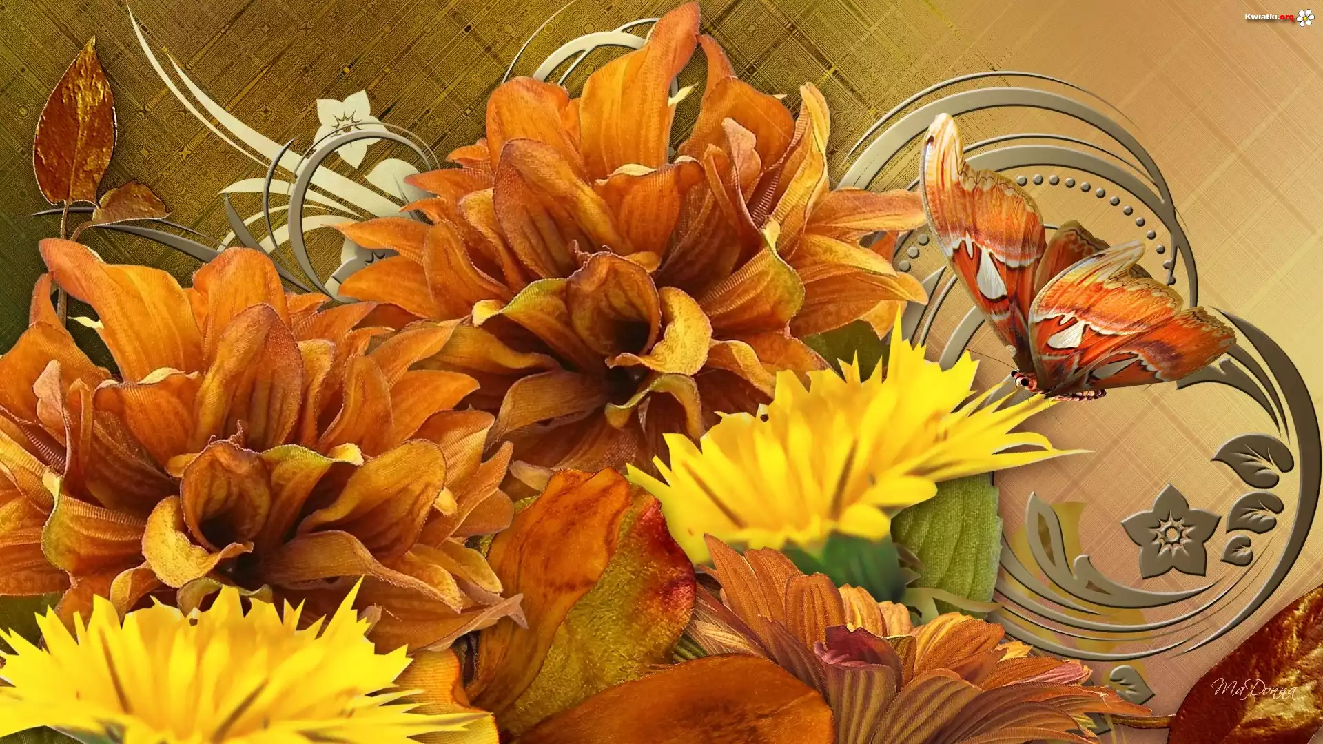 Jesień, Żółte, Pomarańczowe, Kwiaty, Motyl - Zdjęcia