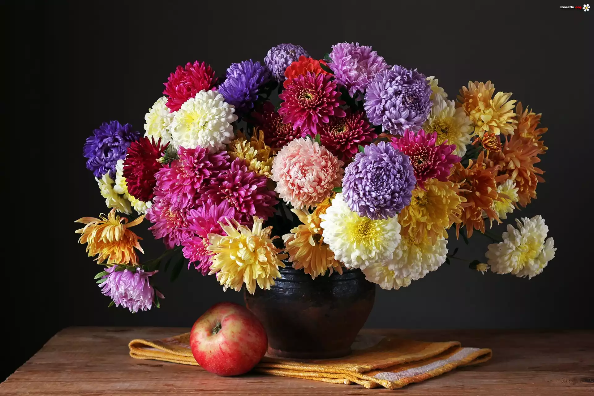 Jesienne, Kwiaty, Astry chryzantemowe, Bukiet, Jabłko - Zdjęcia